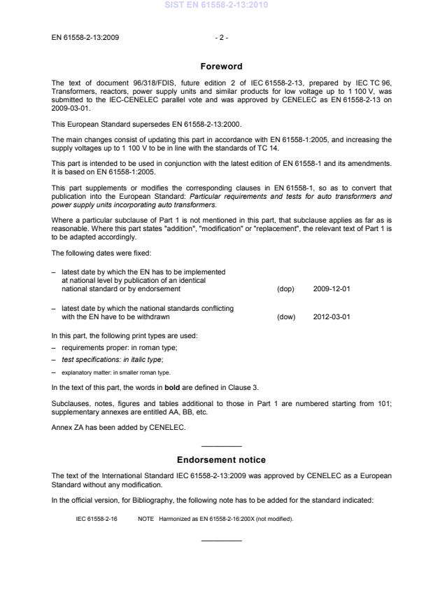 EN 61558-2-13:2009 (CLC adoption of IEC 61558-2-13:2009) is the European particular‑requirements standard for auto transformers and power supply units incorporating auto transformers for supply voltages up to 1 100 V. This second edition updates the 1999 version, aligns this part with EN/IEC 61558-1:2005, raises the covered supply voltage to 1 100 V, and applies to transformers that incorporate electronic circuits. It is a group safety publication (IEC Guide 104) and is intended to be used together with IEC/EN 61558-1 (general requirements and tests).