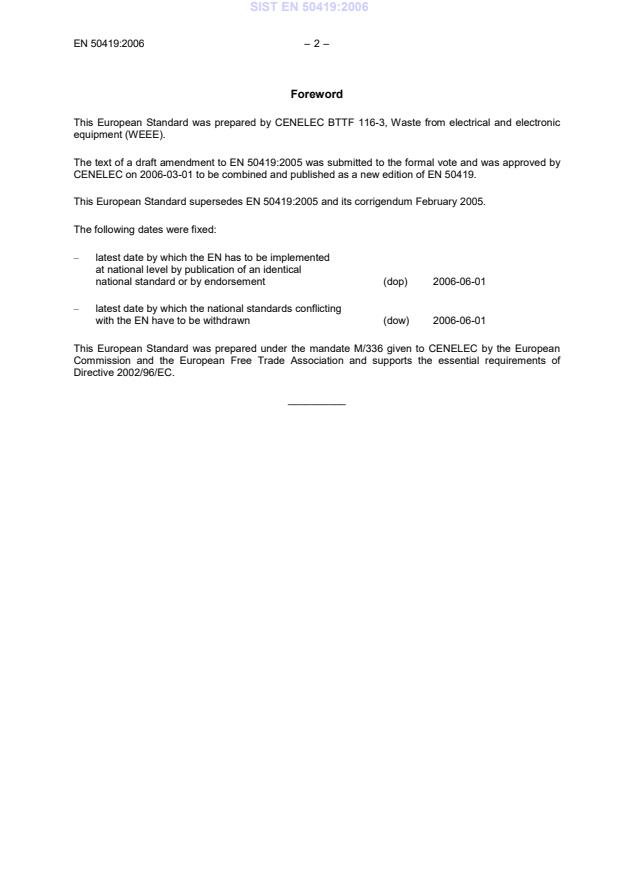 이 기사는 EN 50419:2006 표준에 관한 내용을 다룹니다. 이 표준은 2002/96/EC 지침의 11(2) 조항에 따라 전기 및 전자 장비의 표시를 규정합니다. 이 표준은 2005년 8월 13일 이후 시장에 출시된 전기 및 전자 장비에 대한 '휠이 십자가로 표시된 쓰레기통' 심볼을 표시하는 10(3) 조항에 추가적으로 적용됩니다. 이 표준은 2002/96/EC 지침의 부록 IA에 해당하는 전기 및 전자 장비에 적용되며, 이 지침의 적용 범위에 속하지 않는 다른 유형의 장비에 포함되지 않은 경우입니다. 지침의 부록 IB에는 부록 IA에 기술된 범주에 속하는 제품들의 인과적인 목록이 포함되어 있습니다. 이 표준의 목적은 장비의 생산자를 명확히 식별하고 2005년 8월 13일 이후 시장에 출시되었음을 나타내기 위한 것입니다. 하지만, 이 표준은 생산자 식별을 위한 바코드, 전자 데이터 매체 또는 마이크로칩과 같은 기술적인 운반 매체의 정의는 다루지 않습니다.