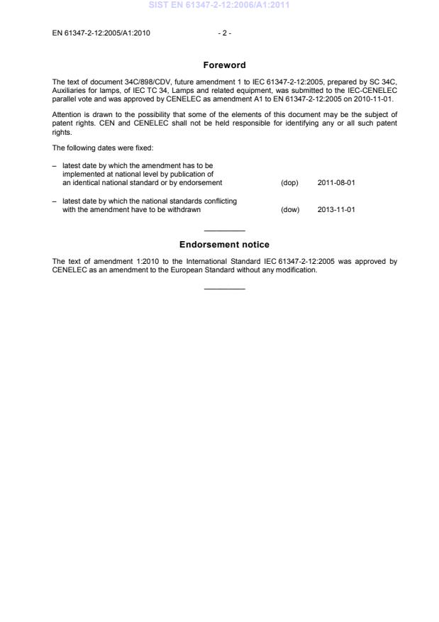 parallel vote and was approved by CENELEC as amendment A1 to EN 61347-2-12:2005 on 2010-11-01.