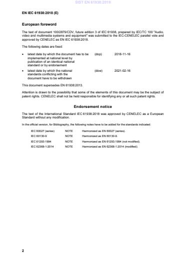 Endorsement notice The text of the International Standard IEC 61938:2018 was approved by CENELEC as a European Standard without any modification. In the official version, for Bibliography, the following notes have to be added for the standards indicated: