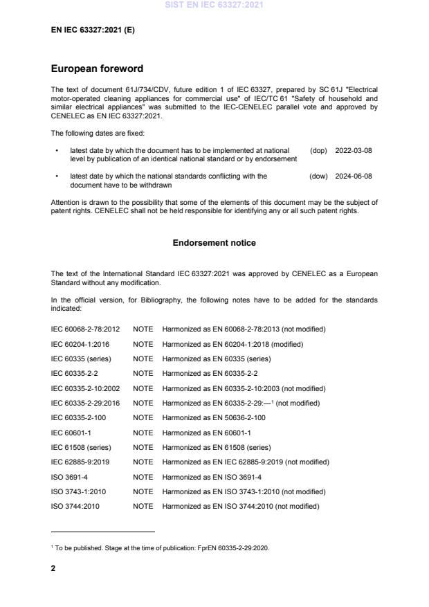 EN IEC 63327:2021 is a standard published by CLC. Its full title is "Automatic floor treatment machines for commercial use - Particular requirements". This standard covers: This International Standard deals with the safety of powered automatic floor treatment machines intended for commercial use indoors for the following applications: - sweeping, - scrubbing, - wet or dry pick-up, - polishing, - application of wax, sealing products and powder-based detergents, - shampooing of floors. The requirements given by this standard are applied in addition to the requirements for commercial floor treatment machines in IEC 60335-2-72, as far as applicable, and mentioned in the relevant clauses. Automatic floor treatment machines solely designed for wet or dry pick-up, additional or modified requirements of IEC 60335-2-69 where stated shall be applicable. Machines covered by this Standard may operate in automatic or manual mode. Modified requirements are given in specific sections of this standard for automatic floor treatment machines not equipped with a manual mode. The automatic floor treatment machines covered by this standard are designed to avoid hazardous contact with persons in the environment applied. It is recognized that automatic floor treatment machines for commercial use might require operation within close proximity to large groups of people, such as in shopping malls and schools. Throughout this standard, the term “machine” is used to refer to an automatic floor treatment machine The following power systems are covered: - rechargeable batteries that are recharged by built-in battery chargers or off-board battery chargers which may be incorporated within the circuitry of the machine, or mounted on the machine and incorporated within the enclosure of the automatic floor treatment machine; or powered by batteries that need to be removed to be recharged with a charger that is external to the machine, - Other systems are under consideration. This standard does not apply to - battery chargers (IEC 60335-2-29); - floor treatment appliances and wet scrubbing machines for household use (IEC 60335-2- 82 10); - floor treatment machines for commercial use (IEC 60335-2-67); - spray extraction machines for commercial use (IEC 60335-2-68); - road sweepers; NOTE 101 In Europe, the EN 17106 series covers road sweepers. - machines designed for use on slopes with a gradient exceeding 20 %; - machines equipped with 88 a power take-off (PTO); - machines designed for use in corrosive or explosive environments (dust, vapour or gas); - machines designed for use in vehicles or on board of ships or aircraft. - vacuum cleaners and water-suction cleaning appliances and automatic battery-operated cleaners for household use (IEC 60335-2-2); - vacuum cleaners designed for pickup of combustible dust; - hand-held mains-operated electrical garden blowers, vacuums and blower vacuums (IEC 60335-2-100); - Electric motor-operated hand-held tools, transportable tools and lawn and garden machinery (IEC 60745 series, IEC 61029 series, IEC 62841 series); - appliances for medical purposes (IEC 60601-1); - robots and robotic devices: Safety requirements of personal care robots (ISO 13482) - machines with parts that extend beyond the contact zone of the machine NOTE 102 Components of the machine that operate outside the contact zone can be evaluated differently. - machines designed for picking up liquids with a flash point below 55 °C; NOTE 103 The flash point temperature limit may vary in different countries. National regulations will need to be taken into account. NOTE 104 Attention is drawn to the fact that in many countries additional requirements on the safe use of the equipment covered can be specified by the national health authorities, the national authorities responsible for the protection of labour, the national water supply authorities and similar authorities;