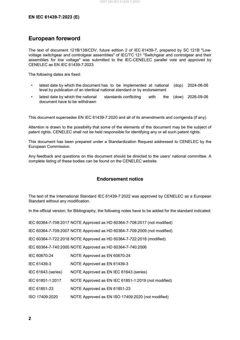 EN IEC 61439-7:2023 has the following relationships with other standards: It is inter standard links to EN IEC 61439-7:2020. Understanding these relationships helps ensure you are using the most current and applicable version of the standard.