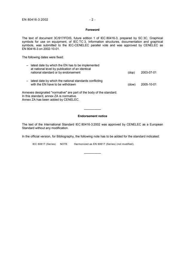 In this standard, annex ZA is normative. Annex ZA has been added by CENELEC. __________ Endorsement notice The text of the International Standard IEC 80416-3:2002 was approved by CENELEC as a European Standard without any modification. In the official version, for Bibliography, the following note has to be added for the standard indicated: IEC 60617 (Series) NOTE Harmonized as EN 60617 (Series) (not modified). __________