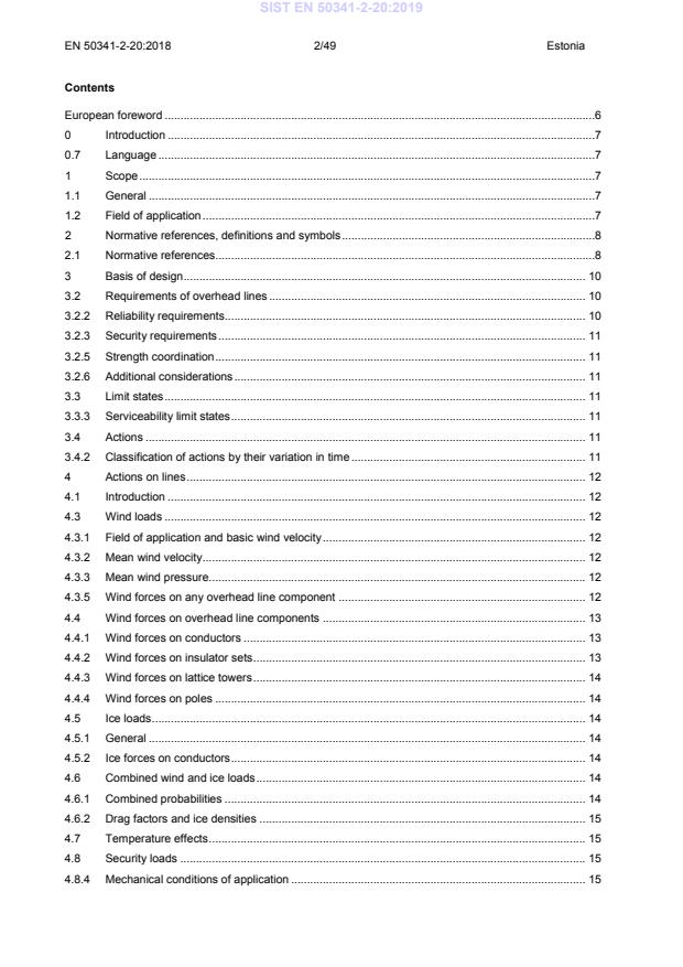 EN 50341-2-20:2018 is a standard published by CLC. Its full title is "Overhead electrical lines exceeding AC 1 kV - Part 2-20: National Normative Aspects (NNA) for ESTONIA (based on EN 50341-1:2012)". This standard covers: General (snc) EE.1 Application to new lines In Estonia the standard EN 50341-1 (Part 1) can only be applied using this NNA (EN 50341-2-20) containing National Normative Aspects for Estonia. This Part 2-20 applies to all new overhead electric lines with nominal system voltages exceeding AC 1 kV and also for low voltage (below 1 kV AC) overhead lines performed by aerial cables. The requirements of the structural design are applicable also for DC overhead lines, where the electrical requirements are given in the Project Specification. (ncpt) EE.2 “New overhead line” A “new overhead line” means a completely new line between two points, A and B. A new branch line of the existing power line should be considered as a new power line including the junction support. Specific requirements for junction support should be defined with the Project Specification. 1.2 Field of application (ncpt) EE.1 Application to covered conductors and aerial cables The standard includes requirements for the design and construction of overhead lines with nominal system voltages up to 45 kV AC equipped with covered conductors and aerial cables. Additionally, the requirements of the equipment standards and manufacturers’ instructions shall be followed. (A-dev) EE.2 Application to mounting of telecommunication equipment The Standard EVS-EN 50341:2013 is applicable to fixing of structural elements for tele-communication (antennas, All Dielectric Self Supporting (ADSS) equipment, junction boxes, etc.), if mounted on power line supports (towers), especially regarding wind forces and ice loads on such fixed elements. The design and installation should be done under the due control of the line owner and/or the competent authority. Mounting of telecommunication equipment on power line supports must be coordinated with the line owner and stated in the Project Specification. This standard applies to telecommunication lines only in the case of their common installation with power lines. This standard does not apply to separately installed telecommunication overhead lines. If telecommunication equipment (antennas, dishes, etc.) will be installed in the transmission line supports, and their size, location or mounting may have major effects on the loads or design of the structures, the requirements of EVS-EN 1993-3-1/NA:2009 shall also to be taken into account. If such structures include conductive parts, the requirements on clearances in subclause 5.8 should be applied. (ncpt) EE.3 Application to installation of other equipment Only equipment belonging to the line (electric or telecommunication line) can be installed on the overhead lines. However, with the permission of the owner of the line, equipment serving communal services or environmental protection like road signs, warning signs or warning balls, etc., may also be installed. The installation height of equipment meant to be installed and maintained by an instructed person shall be such that the work can be done without climbing the support and the distances of safe electrical work can be followed. The additional loads due to this equipment on the line supports shall be taken into account if necessary.