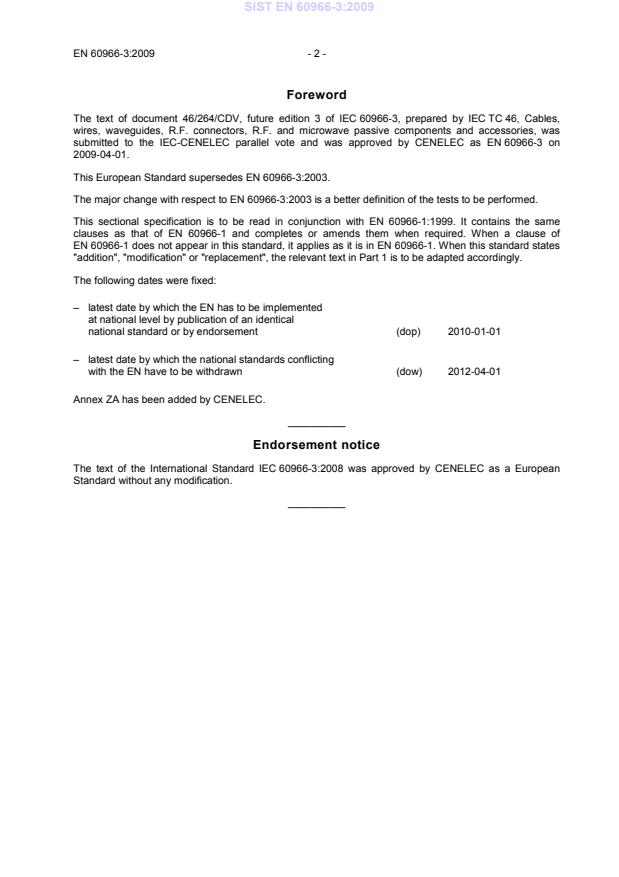 EN 60966-3:2009 (adoption of IEC 60966-3:2008) is a sectional specification for semi-flexible coaxial cable assemblies used in radio frequency (RF) applications operating in the transverse electromagnetic (TEM) mode. Published by CLC/CENELEC in 2009, it defines uniform requirements and test methods for finished, assembled coaxial cable assemblies made of flexible coaxial cable and RF/coaxial connectors. The third edition improves and clarifies the definition of tests to be performed compared with the previous edition.