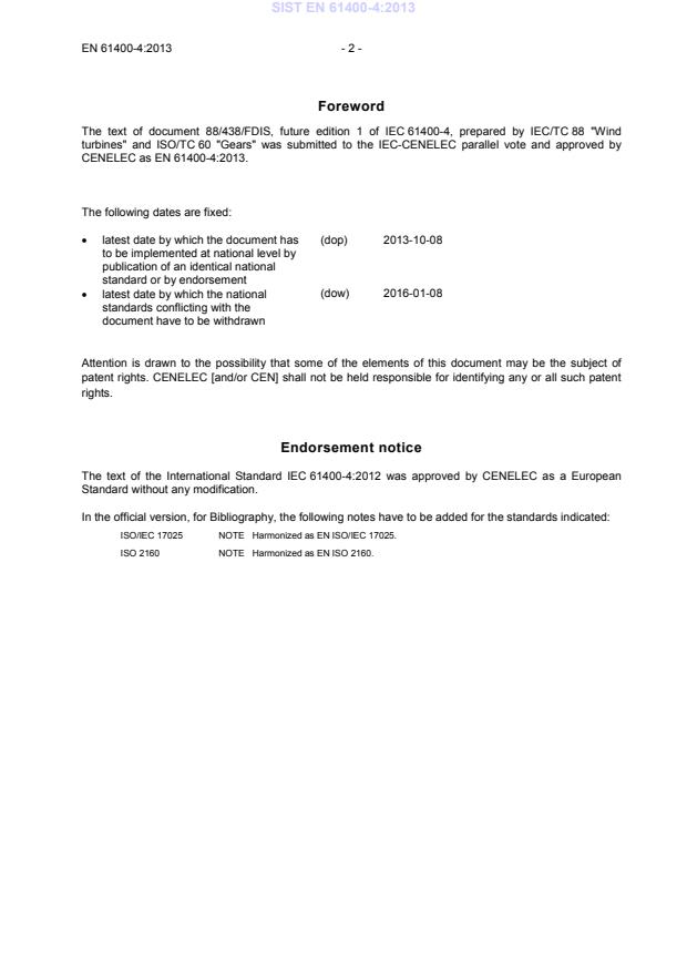 8) Attention is drawn to the Normative references cited in this publication. Use of the referenced publications is indispensable for the correct application of this publication. 9) Attention is drawn to the possibility that some of the elements of this IEC Publication may be the subject of patent rights. IEC shall not be held responsible for identifying any or all such patent rights. International Standard IEC 61400-4 has been prepared by IEC technical committee 88: Wind turbines, in co-operation with ISO technical committee 60: Gears. It is published as a double logo standard. This first edition cancels and replaces ISO 81400-4 published in 2005. It constitutes a technical revision of ISO 81400-4 with extended content and changes in all pertinent sections. This edition includes the following significant technical changes with respect to the previous edition: a) extension of the scope to wind turbines above 2 MW rated power; b) considerations for converging differing approaches to reliability in gear, bearing and wind turbine standards; c) a new clause on wind turbine loads specific to drivetrains; d) new clause on testing and validation of new gearbox designs; SIST EN 61400-4:2013