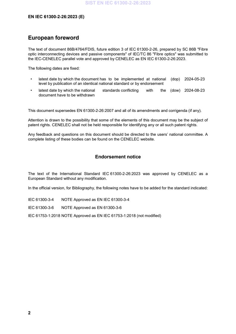 EN IEC 61300-2-26:2023 has the following relationships with other standards: It is inter standard links to EN 61300-2-26:2007. Understanding these relationships helps ensure you are using the most current and applicable version of the standard.