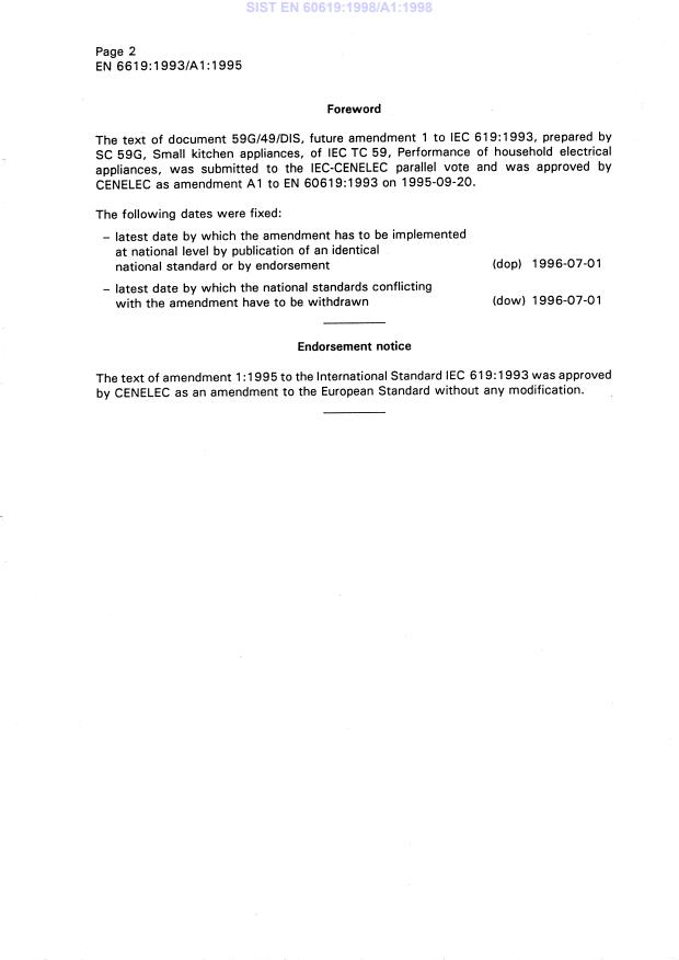 EN 60619:1993/A1:1995 is a amendment published by CLC. Its full title is "Electrically operated food preparation appliances - Methods for measuring the performance". This standard covers: EN following parallel vote