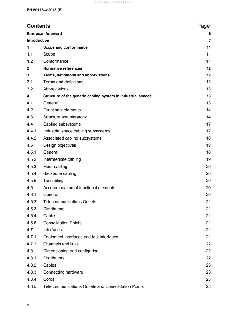 EN 50173-3:2018 is a standard published by CLC. Its full title is "Information technology - Generic cabling systems - Part 3: Industrial spaces". This standard covers: This standard specifies generic cabling to serve the automation islands in industrial premises, or industrial spaces within other types of building. It covers balanced cabling and optical fibre cabling. This standard specifies directly or via reference to EN 50173-1 the: - structure and minimum configuration for generic cabling within industrial spaces; - interfaces at the telecommunications outlet (TO); - performance requirements for cabling links and channels; - implementation requirements and options; - performance requirements for cabling components; - conformance requirements and verification procedures. This standard has taken into account requirements specified in application standards listed in EN 50173-1. Safety and electromagnetic compatibility (EMC) requirements are outside the scope of this standard and are covered by other standards and regulations. However, information given in this standard can be of assistance in meeting these standards and regulations.