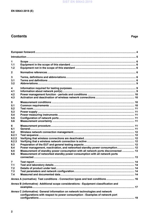 EN 50643:2018 is a standard published by CLC. Its full title is "Electrical and electronic household and office equipment - Measurement of networked standby power consumption of edge equipment". This standard covers: 1.1 Equipment in the scope of this standard This European Standard specifies methods of measurement of electrical power consumption in networked standby and the reporting of the results for edge equipment. Power consumption in standby (other than networked standby) is covered by EN 50564, including the input voltage range. This European Standard also provides a method to test power management and whether it is possible to deactivate wireless network connection(s). NOTE 1 This standard has been written in particular to support Commission Regulation (EU) No 801/2013 for the measurement of energy consumption in networked standby. This standard applies to electrical products with a rated input voltage of 230 V a.c. for single phase products and 400 V a.c. for three phase products. NOTE 2 The measurement of energy consumption and performance of products during intended use are generally specified in product standards and are not covered by this standard. NOTE 3 The term "products" in this standard includes household appliances or information technology products, consumer electronics, audio, video and multimedia systems; however the measurement methodology could be applied to other products. Where this standard is referenced by more specific standards or procedures, these should define and name the relevant conditions to which this test procedure is applied. 1.2 Equipment not in the scope of this standard This European Standard does not apply to the measurement of electrical power consumption in networked standby for interconnecting equipment. NOTE Measurement of electrical power consumption in networked standby for interconnecting equipment is the subject of ETSI standard EN 303 423 "Environmental Engineering (EE) - Electrical and electronic household and office equipment; Measurement of networked standby power consumption for interconnecting equipment".