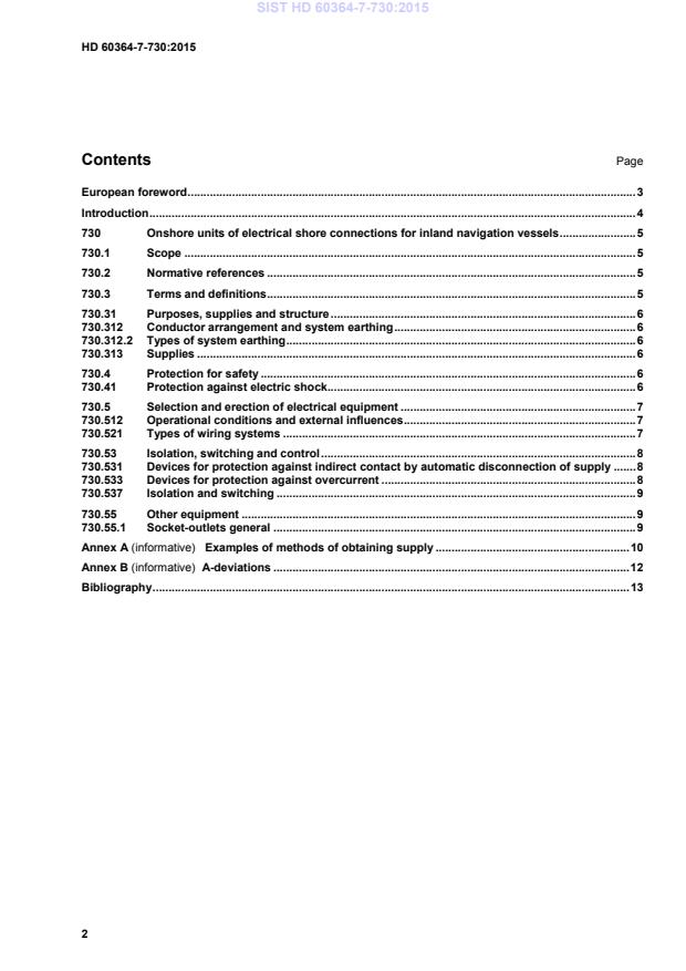 HD 60364-7-730:2015 is a standardization document published by CLC. Its full title is "Low-voltage electrical installations - Part 7-730: Requirements for special installations or locations - Onshore units of electrical shore connections for inland navigation vessels". This standard covers: The particular requirements specified in this part of HD 60364 apply to onshore installations dedicated to supply inland navigation vessels for commercial and administrative purpose, berthed in ports and berths. For single- and three-phase supplies to pleasure craft, use HD 60364-7-709. This part of HD 60364 applies to installations with nominal supply voltage a.c. 400/230 V, single-phase and three-phase, 50 Hz. Additional requirements that do not relate to electrical installation are given in EN 15869-1 and EN 15869-2. The particular requirements do not apply to the onboard installations of inland navigation vessels including their connection cables. Additional requirements on the onboard installation are given in EN 15869-3.