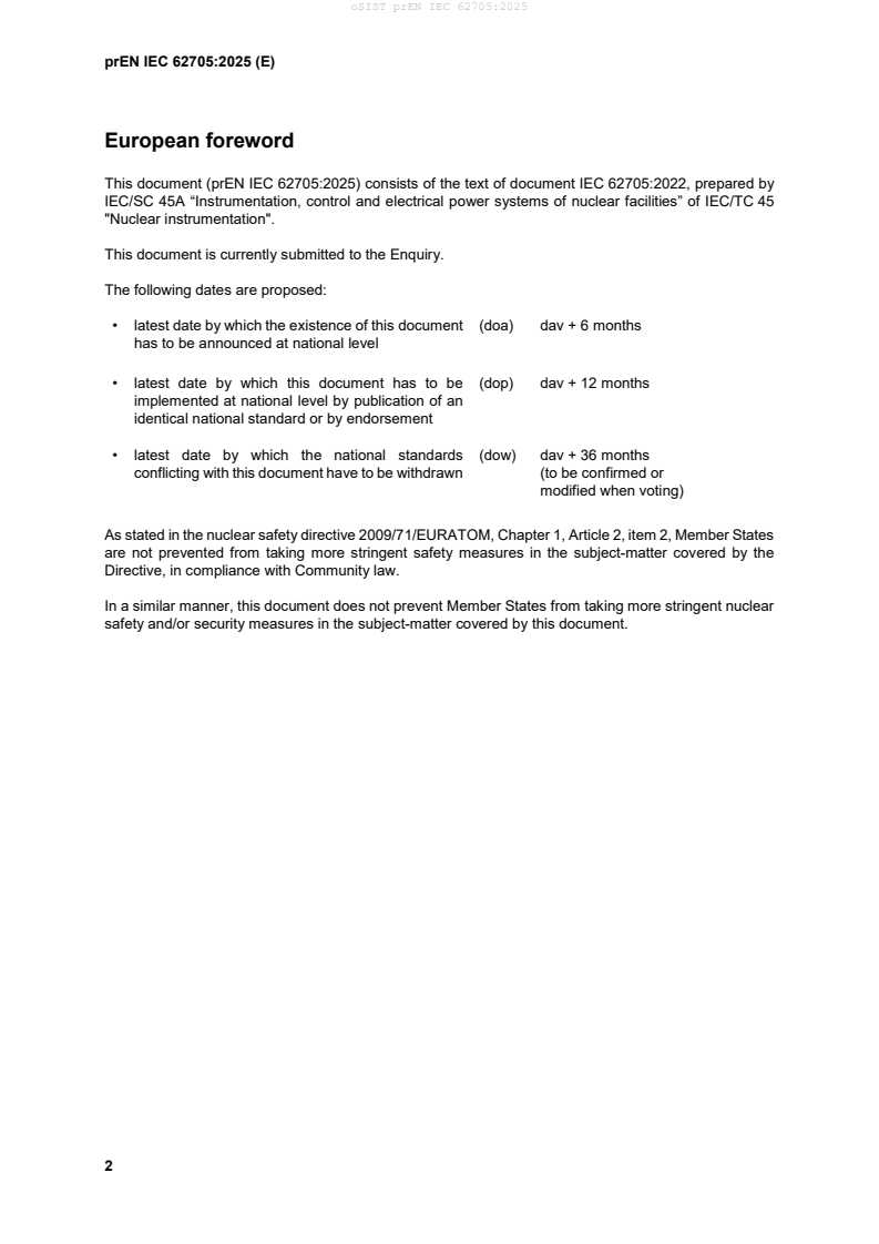 prEN IEC 62705:2025 is a draft published by CLC. Its full title is "Nuclear facilities - Instrumentation and control important to safety – Radiation monitoring systems (RMS): Characteristics and lifecycle". This standard covers: IEC 62705:2022 gives requirements for the lifecycle management of radiation monitoring systems (RMS) and gives guidance on the application of existing IEC standards covering the design and qualification of systems and equipment. The purpose of this document is to lay down requirements for the lifecycle management of RMSs and give application guidance. This document is intended to be consistent with the latest versions of International Standards dealing with radiation monitors, sampling of radioactive materials, instruments calibration, hardware and software design, classification, and qualification. This document is applicable to RMSs installed in nuclear facilities intended for use during normal operation, anticipated operational occurrences (AOO), design basis accidents (DBA) and design extension conditions (DEC), including severe accidents (SA). This second edition cancels and replaces the first edition published in 2014. This edition includes the following significant technical changes with respect to the previous edition: - modification of the title. - to be consistent with the categorization of the accident condition. - to update the references to new standards published since the first edition. - to update the terms and definitions.