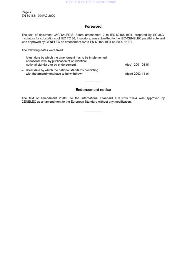 EN 60168:1994/A2:2000 is a amendment published by CLC. Its full title is "Tests on indoor and outdoor post insulators of ceramic material or glass for systems with nominal voltages greater than 1 kV". This standard covers: EN following parallel vote