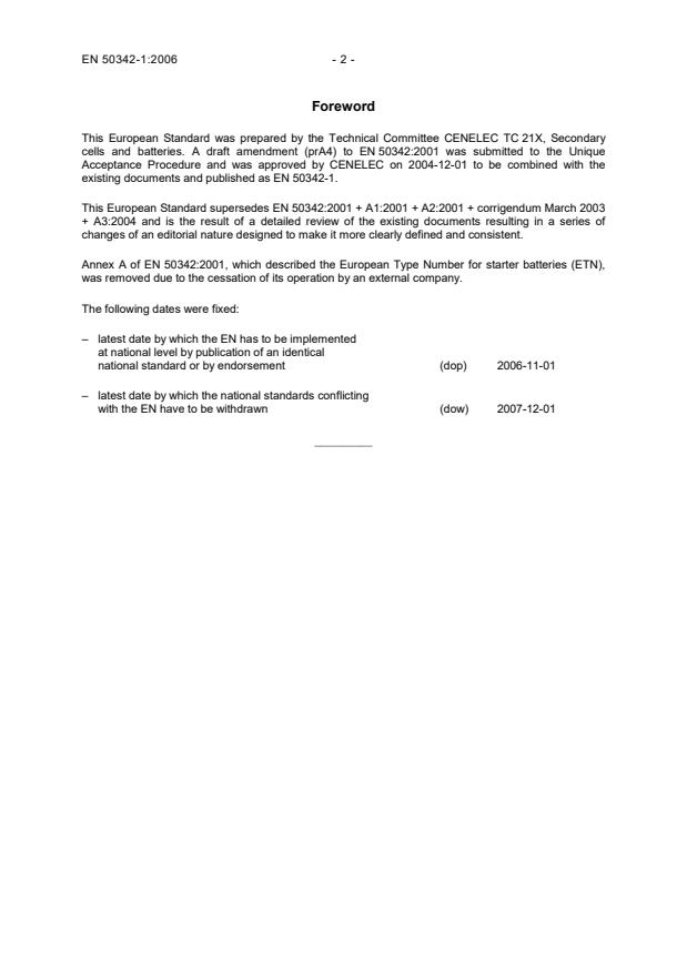 Annex A of EN 50342:2001, which described the European Type Number for starter batteries (ETN), was removed due to the cessation of its operation by an external company. The following dates were fixed: – latest date by which the EN has to be implemented
