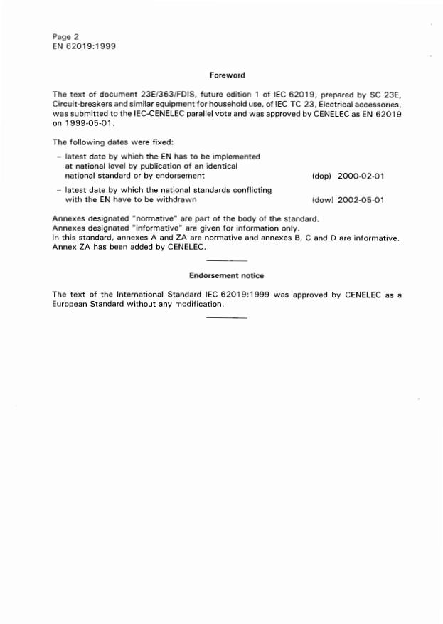 EN 62019:1999 (adopted by CLC) - identical to IEC 62019:1999 - defines requirements for auxiliary contact units used with circuit‑breakers and similar equipment for household and similar installations. The standard applies to auxiliary contacts associated (or intended to be associated) with overcurrent circuit‑breakers and residual‑current devices (RCCBs/RCBOs) with rated voltages up to 440 V a.c. and 250 V d.c., and rated currents up to 10 A. Its objective is to specify characteristics, marking, construction, performance and test requirements to ensure safe and reliable auxiliary switching functions.