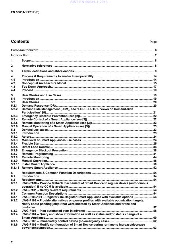 2 Contents Page European foreword . 6 Introduction . 7 1 Scope . 8 2 Normative references . 8 3 Terms, definitions and abbreviations . 8 4 Process & Requirements to enable interoperability . 14 4.1 Introduction . 14 4.2 Conceptual Architecture Model . 15 4.3 Top Down Approach . 17 4.4 Process . 18 5 User Stories and Use Cases . 19 5.1 Introduction . 19 5.2 User Stories . 20 5.2.1 Demand Response (DR) . 20 5.2.2 Demand Side Management (DSM), see “EURELECTRIC Views on Demand-Side Participation” [5] . 21 5.2.3 Emergency Blackout Prevention (see [2]) . 22 5.2.4 Remote Control of a Smart Appliance (see [3]) . 22 5.2.5 Remote Monitoring of a Smart Appliance (see [3]) . 23 5.2.6 Manual Operation of a Smart Appliance (see [3]) . 23 5.3 Derived use cases. 23 5.3.1 Introduction . 23 5.3.2 Actors . 24 5.3.3 Main level of Smart Appliances use cases . 24 5.3.4 Flexible Start . 25 5.3.5 Direct Load Control . 34 5.3.6 Emergency Blackout Prevention . 38 5.3.7 Remote Programming . 41 5.3.8 Remote Monitoring . 44 5.3.9 Manual Operation. 48 5.3.10 Install Smart Appliance . 50 5.3.11 Remove Smart Appliance . 52 6 Requirements & Common Function Descriptions . 54 6.1 Introduction . 54 6.2 Requirements . 54 6.2.1 JWG-R100 – Provide fallback mechanism of Smart Device to regular device (autonomous operation) if no CCM is available . 54 6.2.2 JWG-R101 – Safety relevant requirements . 54 6.3 Common Function Descriptions . 54 6.3.1 JWG-F100/101 – Register / De-Register Smart Appliance with available options . 54 6.3.2 JWG-F102 – Provide alternatives on power profiles with available optimization targets, Notify about pending job(s) that were initiated by Smart Aplliance and/or the end-customer . 57 6.3.3 JWG-F103 – Plan automated start in advance . 58 6.3.4 JWG-F104 – Query and show information as well as status and/or status change of a Smart Appliance. 60 6.3.5 JWG-F105 – Immediately control device (no emergency case) . 62 6.3.6 JWG-F106 – Modify configuration of Smart Device during runtime to increase/decrease power consumption . 63 SIST EN 50631-1:2018