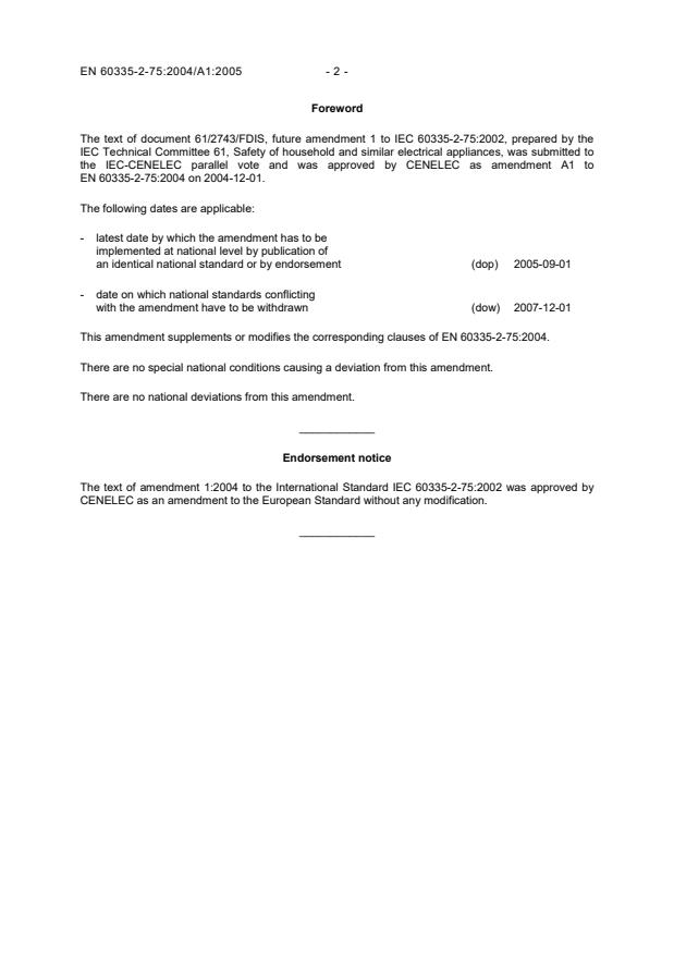 This amendment A1 modifies the European Standard EN 60335-2-75:2004; it was approved by