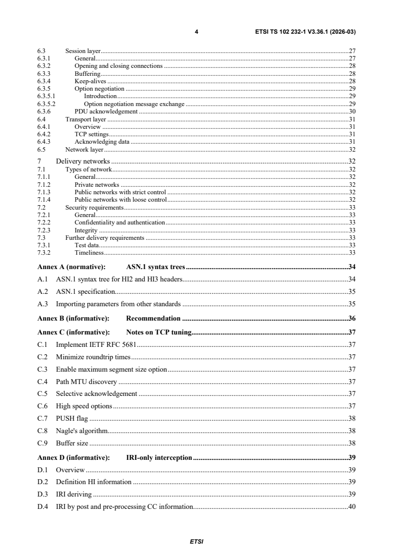 ETSI TS 102 232-1 V3.36.1 (2026-03) is a standard published by the European Telecommunications Standards Institute (ETSI). Its full title is "Lawful Interception (LI); Handover Interface and Service-Specific Details (SSD) for IP delivery; Part 1: Handover specification for IP delivery". This standard covers: RTS/LI-00308-1