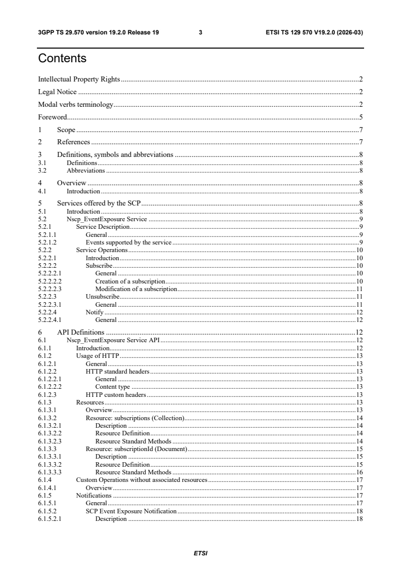 ETSI TS 129 570 V19.2.0 (2026-03) is a standard published by the European Telecommunications Standards Institute (ETSI). Its full title is "5G; 5G System; Service Communication Proxy Services; Stage 3 (3GPP TS 29.570 version 19.2.0 Release 19)". This standard covers: RTS/TSGC-0429570vj20