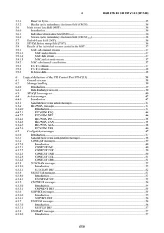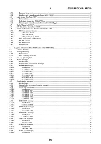 ETSI ETSI EN 300 797 V1.3.1 (2017-11) 4 5.5.1 Reserved bytes . 35 5.5.2 Header cyclic redundancy checksum field (CRCH) . 36 5.6 Main stream data field (MST) . 36 5.6.0 Introduction. 36 5.6.1 Individual stream data field (ISTDStrm) . 36 5.6.2 Stream cyclic redundancy checksum field (CRCSTStrm) . 36 5.7 End-of-frame field (EOF) . 36 5.8 STI-D(LI) time stamp field (TIST) . 36 5.9 Details of the individual streams carried in the MST . 37 5.9.1 MSC sub-channel streams . 37 5.9.1.1 MSC audio stream . 37 5.9.1.2 MSC data stream . 37 5.9.1.3 MSC packet mode stream . 37 5.9.2 MSC sub-channel contributions . 37 5.9.3 FIC FIG stream . 37 5.9.4 FIC FIB stream . 38 5.9.5 In-house data . 38 6 Logical definition of the STI Control Part STI-C(LI) . 38 6.1 General structure . 38 6.2 Message handling . 39 6.2.0 Introduction. 39 6.2.1 Data Exchange Sessions . 40 6.3 STI-C(LI) message set . 40 6.4 Action messages . 42 6.4.0 Introduction. 42 6.4.1 General rules to use action messages . 43 6.4.2 RCONFIG messages . 43 6.4.2.0 Introduction . 43 6.4.2.1 RCONFIG REQ . 44 6.4.2.2 RCONFIG DEF . 44 6.4.2.3 RCONFIG INF . 45 6.4.2.4 RCONFIG CAN . 45 6.4.2.5 RCONFIG ACK . 46 6.4.2.6 RCONFIG ERR . 46 6.5 Configuration messages . 47 6.5.0 Introduction. 47 6.5.1 General rules to use configuration messages . 48 6.5.2 CONFDEF messages . 49 6.5.2.0 Introduction . 49 6.5.2.1 CONFDEF INF . 49 6.5.2.2 CONFDEF DEF . 50 6.5.2.3 CONFDEF END . 50 6.5.2.4 CONFDEF DEL . 51 6.5.2.5 CONFDEF ERR . 51 6.5.3 SUBCHAN messages . 52 6.5.3.0 Introduction . 52 6.5.3.1 SUBCHAN DEF . 52 6.5.4 USESTRM messages . 53 6.5.4.0 Introduction . 53 6.5.4.1 USESTRM DEF . 53 6.5.5 CMPNENT messages . 54 6.5.5.0 Introduction . 54 6.5.5.1 CMPNENT DEF . 55 6.5.6 SERVICE messages . 55 6.5.6.0 Introduction . 55 6.5.6.1 SERVICE DEF . 56 6.5.7 USEFIGF messages . 56 6.5.7.0 Introduction . 56 6.5.7.1 USEFIGF DEF . 57 6.5.8 USERAPP messages . 57 6.5.8.0 Introduction . 57 SIST EN 300 797 V1.3.1:2018