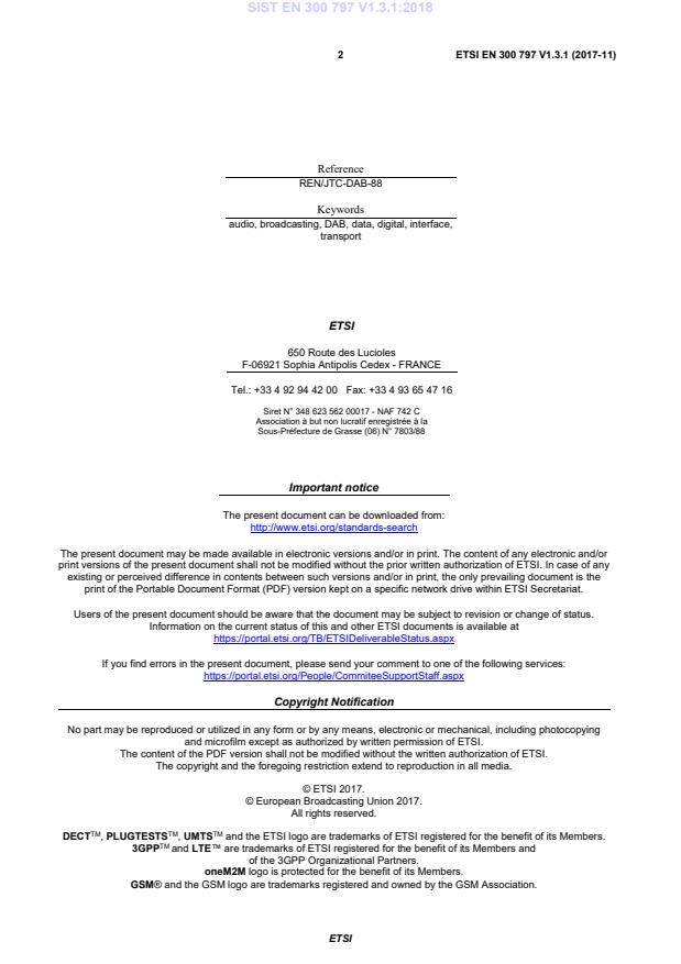 DECTTM, PLUGTESTSTM, UMTSTM and the ETSI logo are trademarks of ETSI registered for the benefit of its Members. 3GPPTM and LTE™ are trademarks of ETSI registered for the benefit of its Members and of the 3GPP Organizational Partners. oneM2M logo is protected for the benefit of its Members. GSM® and the GSM logo are trademarks registered and owned by the GSM Association. SIST EN 300 797 V1.3.1:2018