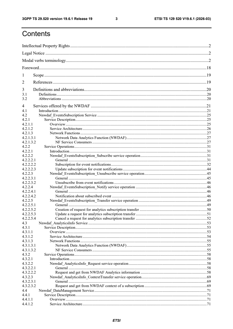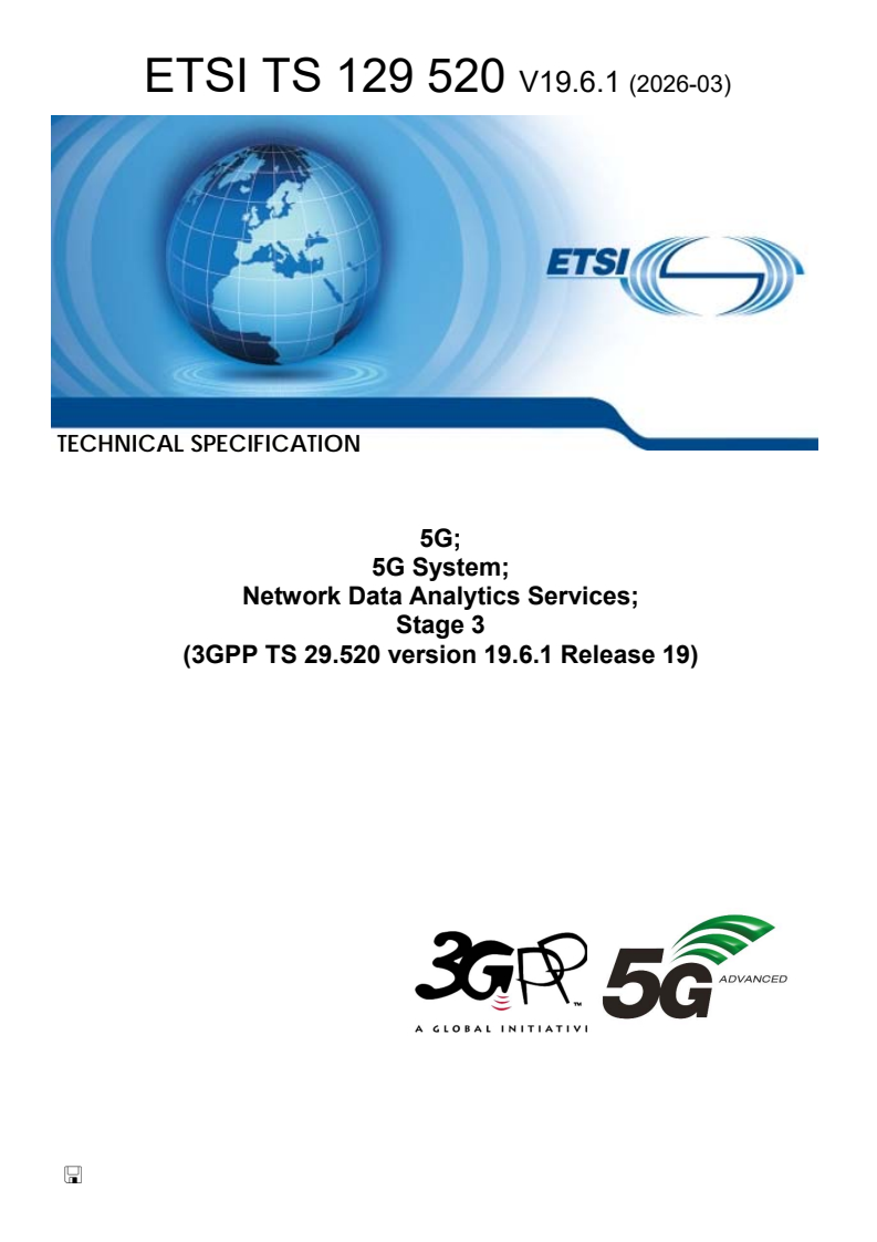 ETSI TS 129 520 V19.6.1 (2026-03) is a standard published by the European Telecommunications Standards Institute (ETSI). Its full title is "5G; 5G System; Network Data Analytics Services; Stage 3 (3GPP TS 29.520 version 19.6.1 Release 19)". This standard covers: RTS/TSGC-0329520vj61