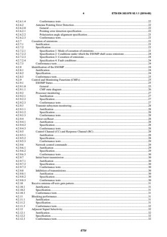 ETSI ETSI EN 303 978 V2.1.1 (2016-05) 4 4.2.6.1.4 Conformance tests . 22 4.2.6.2 Antenna Pointing Error Detection . 22 4.2.6.2.0 General . 22 4.2.6.2.1 Pointing error detection specification . 22 4.2.6.2.2 Polarization angle alignment specification . 23 4.2.6.2.3 Conformance tests . 23 4.2.7 Cessation of emissions . 23 4.2.7.1 Justification . 23 4.2.7.2 Specification. 23 4.2.7.2.1 Specification 1: Mode of cessation of emissions . 23 4.2.7.2.2 Specification 2: Conditions under which the ESOMP shall cease emissions . 24 4.2.7.2.3 Specification 3: Cessation of emissions . 24 4.2.7.2.4 Specification 4: Fault conditions . 24 4.2.7.3 Conformance tests . 24 4.2.8 Identification of the ESOMP . 24 4.2.8.1 Justification . 24 4.2.8.2 Specification. 24 4.2.8.3 Conformance tests . 25 4.2.9 Control and Monitoring Functions (CMFs) . 25 4.2.9.1 ESOMP States . 25 4.2.9.1.0 General . 25 4.2.9.1.1 CMF state diagram . 26 4.2.9.2 Processor monitoring . 27 4.2.9.2.1 Justification . 27 4.2.9.2.2 Specification . 27 4.2.9.2.3 Conformance tests . 27 4.2.9.3 Transmit subsystem monitoring . 28 4.2.9.3.1 Justification . 28 4.2.9.3.2 Specification . 28 4.2.9.3.3 Conformance tests . 28 4.2.9.4 Power-on/Reset . 28 4.2.9.4.1 Justification . 28 4.2.9.4.2 Specification . 28 4.2.9.4.3 Conformance tests . 28 4.2.9.5 Control Channel (CC) and Response Channel (RC) . 28 4.2.9.5.1 Justification . 28 4.2.9.5.2 Specification . 28 4.2.9.5.3 Conformance tests . 29 4.2.9.6 Network control commands . 29 4.2.9.6.1 Justification . 29 4.2.9.6.2 Specification . 29 4.2.9.6.3 Conformance tests . 30 4.2.9.7 Initial burst transmission . 30 4.2.9.7.1 Justification . 30 4.2.9.7.2 Specification . 30 4.2.9.7.3 Conformance tests . 30 4.2.9.8 Inhibition of transmissions . 30 4.2.9.8.1 Justification . 30 4.2.9.8.2 Specification . 30 4.2.9.8.3 Conformance tests . 30 4.2.10 Receive antenna off-axis gain pattern . 31 4.2.10.1 Justification . 31 4.2.10.2 Specification. 31 4.2.10.3 Conformance tests . 31 4.2.11 Blocking performance . 31 4.2.11.1 Justification . 31 4.2.11.2 Specification. 31 4.2.11.3 Conformance tests . 32 4.2.12 Adjacent Signal Selectivity . 32 4.2.12.1 Justification . 32 4.2.12.2 Specification. 32 4.2.12.3 Conformance tests . 32 SIST EN 303 978 V2.1.1:2016