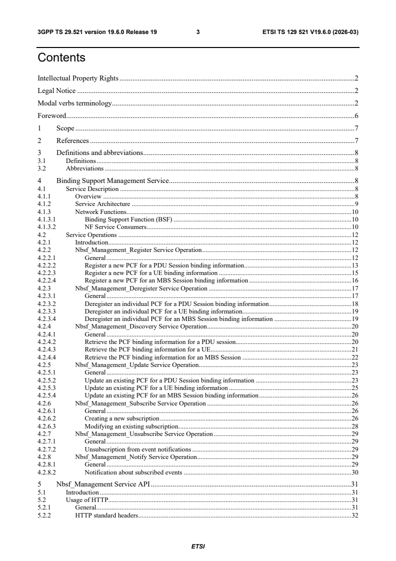 ETSI TS 129 521 V19.6.0 (2026-03) is a standard published by the European Telecommunications Standards Institute (ETSI). Its full title is "5G; 5G System; Binding Support Management Service; Stage 3 (3GPP TS 29.521 version 19.6.0 Release 19)". This standard covers: RTS/TSGC-0329521vj60