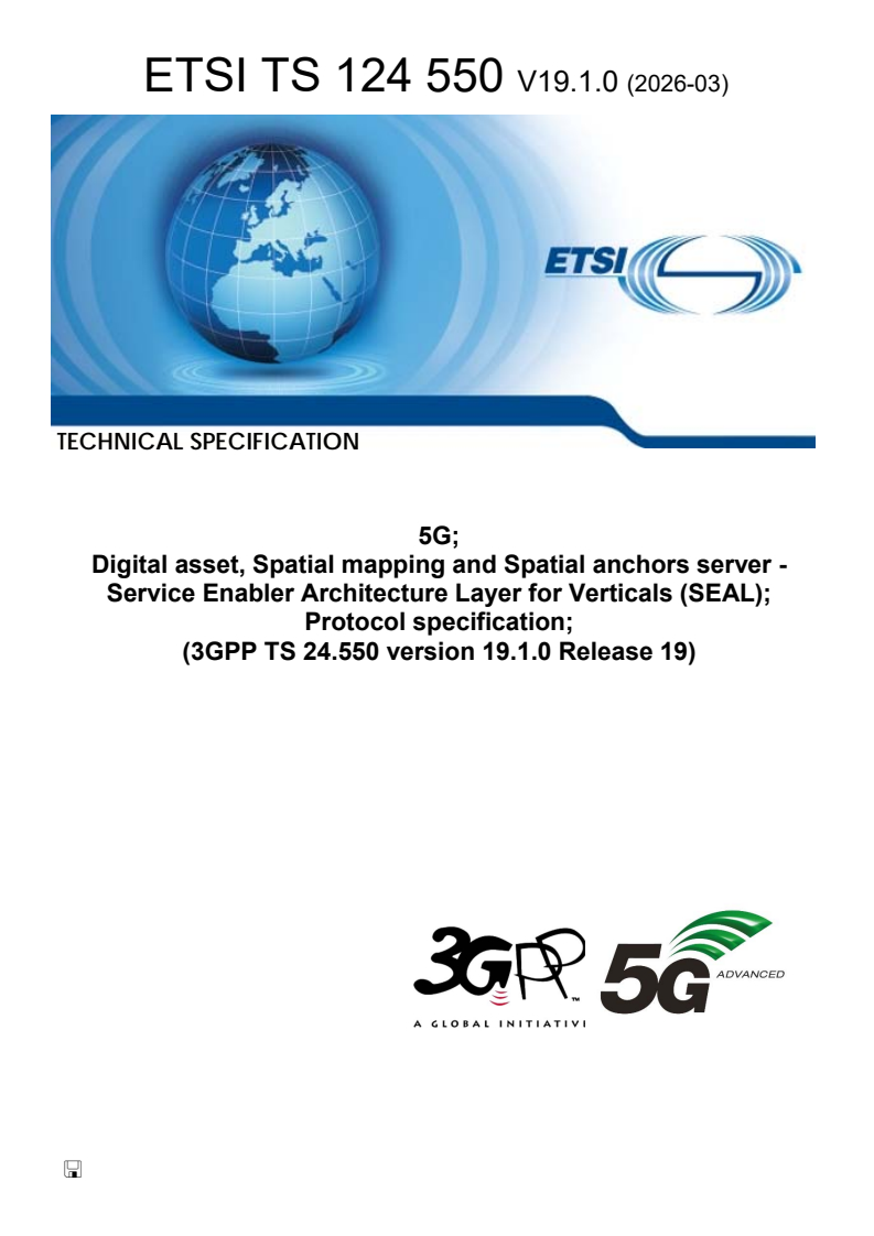 ETSI TS 124 550 V19.1.0 (2026-03) - 5G; Digital asset, Spatial mapping and Spatial anchors server - Service Enabler Architecture Layer for Verticals (SEAL); Protocol specification; (3GPP TS 24.550 version 19.1.0 Release 19)