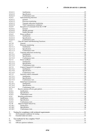 ETSI ETSI EN 301 443 V2.1.1 (2016-05) 4 4.2.6.2.1 Justification . 22 4.2.6.2.2 Specification . 22 4.2.6.2.3 Conformance tests . 23 4.2.6.3 Self-monitoring functions . 23 4.2.6.3.1 General . 23 4.2.6.3.2 Processor monitoring . 23 4.2.6.3.3 Transmit subsystem monitoring . 24 4.2.6.3.4 VSAT transmission validation . 24 4.2.6.4 Reception of commands from the CCMF . 25 4.2.6.4.1 General . 25 4.2.6.4.2 Disable message . 25 4.2.6.4.3 Enable Message . 26 4.2.6.5 Power-on/Reset . 26 4.2.6.5.1 Justification . 26 4.2.6.5.2 Specification . 26 4.2.6.5.3 Conformance tests . 26 4.2.7 Class B Control and Monitoring Functions . 26 4.2.7.0 General . 26 4.2.7.1 Processor monitoring . 27 4.2.7.1.1 Justification . 27 4.2.7.1.2 Specification . 27 4.2.7.1.3 Conformance tests . 27 4.2.7.2 Transmit subsystem monitoring . 28 4.2.7.2.1 Justification . 28 4.2.7.2.2 Specification . 28 4.2.7.2.3 Conformance tests . 28 4.2.7.3 Power-on/Reset . 28 4.2.7.3.1 Justification . 28 4.2.7.3.2 Specification . 28 4.2.7.3.3 Conformance tests . 28 4.2.7.4 Control Channel (CC) reception . 28 4.2.7.4.1 Justification . 28 4.2.7.4.2 Specification . 28 4.2.7.4.3 Conformance tests . 28 4.2.7.5 Network control commands . 29 4.2.7.5.1 Justification . 29 4.2.7.5.2 Specification . 29 4.2.7.5.3 Conformance test . 29 4.2.7.6 Initial burst transmission . 29 4.2.7.6.1 Justification . 29 4.2.7.6.2 Specification . 29 4.2.7.6.3 Conformance tests . 29 4.2.8 Receive antenna off-axis gain pattern . 29 4.2.8.1 Justification . 29 4.2.8.2 Specification. 29 4.2.8.3 Conformance tests . 30 4.2.9 Blocking performance . 30 4.2.9.1 Justification . 30 4.2.9.2 Specification. 30 4.2.9.3 Conformance tests . 30 4.2.10 Adjacent Signal Selectivity . 30 4.2.10.1 Justification . 30 4.2.10.2 Specification. 30 4.2.10.3 Conformance tests . 31 5 Testing for compliance with technical requirements . 31 5.1 Environmental conditions for testing . 31 5.2 Essential radio test suites . 31 6 Test methods for the complete VSAT . 31 6.1 General . 31 6.2 Off-axis spurious radiation . 32 SIST EN 301 443 V2.1.1:2016