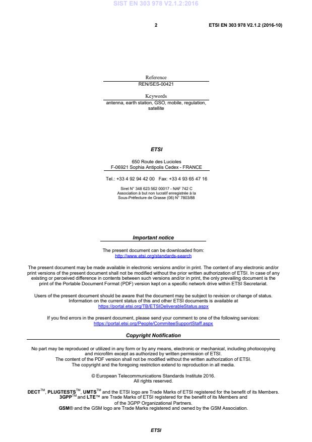 DECTTM, PLUGTESTSTM, UMTSTM and the ETSI logo are Trade Marks of ETSI registered for the benefit of its Members. 3GPPTM and LTE™ are Trade Marks of ETSI registered for the benefit of its Members and of the 3GPP Organizational Partners. GSM® and the GSM logo are Trade Marks registered and owned by the GSM Association. SIST EN 303 978 V2.1.2:2016