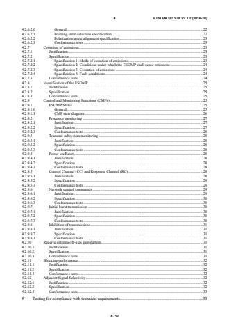 ETSI ETSI EN 303 978 V2.1.2 (2016-10) 4 4.2.6.2.0 General . 22 4.2.6.2.1 Pointing error detection specification . 22 4.2.6.2.2 Polarization angle alignment specification . 23 4.2.6.2.3 Conformance tests . 23 4.2.7 Cessation of emissions . 23 4.2.7.1 Justification . 23 4.2.7.2 Specification. 23 4.2.7.2.1 Specification 1: Mode of cessation of emissions . 23 4.2.7.2.2 Specification 2: Conditions under which the ESOMP shall cease emissions . 24 4.2.7.2.3 Specification 3: Cessation of emissions . 24 4.2.7.2.4 Specification 4: Fault conditions . 24 4.2.7.3 Conformance tests . 24 4.2.8 Identification of the ESOMP . 25 4.2.8.1 Justification . 25 4.2.8.2 Specification. 25 4.2.8.3 Conformance tests . 25 4.2.9 Control and Monitoring Functions (CMFs) . 25 4.2.9.1 ESOMP States . 25 4.2.9.1.0 General . 25 4.2.9.1.1 CMF state diagram . 26 4.2.9.2 Processor monitoring . 27 4.2.9.2.1 Justification . 27 4.2.9.2.2 Specification . 27 4.2.9.2.3 Conformance tests . 28 4.2.9.3 Transmit subsystem monitoring . 28 4.2.9.3.1 Justification . 28 4.2.9.3.2 Specification . 28 4.2.9.3.3 Conformance tests . 28 4.2.9.4 Power-on/Reset . 28 4.2.9.4.1 Justification . 28 4.2.9.4.2 Specification . 28 4.2.9.4.3 Conformance tests . 28 4.2.9.5 Control Channel (CC) and Response Channel (RC) . 28 4.2.9.5.1 Justification . 28 4.2.9.5.2 Specification . 29 4.2.9.5.3 Conformance tests . 29 4.2.9.6 Network control commands . 29 4.2.9.6.1 Justification . 29 4.2.9.6.2 Specification . 30 4.2.9.6.3 Conformance tests . 30 4.2.9.7 Initial burst transmission . 30 4.2.9.7.1 Justification . 30 4.2.9.7.2 Specification . 30 4.2.9.7.3 Conformance tests . 30 4.2.9.8 Inhibition of transmissions . 31 4.2.9.8.1 Justification . 31 4.2.9.8.2 Specification . 31 4.2.9.8.3 Conformance tests . 31 4.2.10 Receive antenna off-axis gain pattern . 31 4.2.10.1 Justification . 31 4.2.10.2 Specification. 31 4.2.10.3 Conformance tests . 31 4.2.11 Blocking performance . 32 4.2.11.1 Justification . 32 4.2.11.2 Specification. 32 4.2.11.3 Conformance tests . 32 4.2.12 Adjacent Signal Selectivity . 32 4.2.12.1 Justification . 32 4.2.12.2 Specification. 32 4.2.12.3 Conformance tests . 33 5 Testing for compliance with technical requirements . 33 SIST EN 303 978 V2.1.2:2016