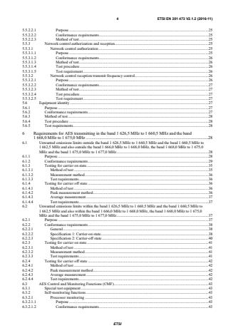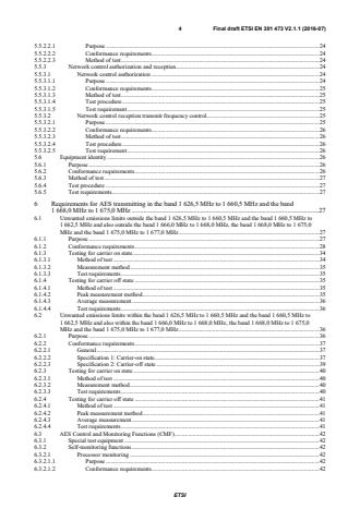 ETSI ETSI EN 301 473 V2.1.2 (2016-11) 4 5.5.2.2.1 Purpose . 25 5.5.2.2.2 Conformance requirements . 25 5.5.2.2.3 Method of test . 25 5.5.3 Network control authorization and reception . 25 5.5.3.1 Network control authorization . 25 5.5.3.1.1 Purpose . 25 5.5.3.1.2 Conformance requirements . 26 5.5.3.1.3 Method of test . 26 5.5.3.1.4 Test procedure . 26 5.5.3.1.5 Test requirement . 26 5.5.3.2 Network control reception transmit frequency control. 26 5.5.3.2.1 Purpose . 26 5.5.3.2.2 Conformance requirements . 27 5.5.3.2.3 Method of test . 27 5.5.3.2.4 Test procedure . 27 5.5.3.2.5 Test requirement . 27 5.6 Equipment identity . 27 5.6.1 Purpose . 27 5.6.2 Conformance requirements . 27 5.6.3 Method of test . 28 5.6.4 Test procedure . 28 5.6.5 Test requirements . 28 6 Requirements for AES transmitting in the band 1 626,5 MHz to 1 660,5 MHz and the band 1 668,0 MHz to 1 675,0 MHz . 28 6.1 Unwanted emissions limits outside the band 1 626,5 MHz to 1 660,5 MHz and the band 1 660,5 MHz to 1 662,5 MHz and also outside the band 1 666,0 MHz to 1 668,0 MHz, the band 1 668,0 MHz to 1 675,0 MHz and the band 1 675,0 MHz to 1 677,0 MHz . 28 6.1.1 Purpose . 28 6.1.2 Conformance requirements . 29 6.1.3 Testing for carrier on state . 35 6.1.3.1 Method of test . 35 6.1.3.2 Measurement method . 36 6.1.3.3 Test requirements . 36 6.1.4 Testing for carrier off state . 36 6.1.4.1 Method of test . 36 6.1.4.2 Peak measurement method . 36 6.1.4.3 Average measurement . 37 6.1.4.4 Test requirements . 37 6.2 Unwanted emissions limits within the band 1 626,5 MHz to 1 660,5 MHz and the band 1 660,5 MHz to 1 662,5 MHz and also within the band 1 666,0 MHz to 1 668,0 MHz, the band 1 668,0 MHz to 1 675,0 MHz and the band 1 675,0 MHz to 1 677,0 MHz . 37 6.2.1 Purpose . 37 6.2.2 Conformance requirements . 38 6.2.2.1 General . 38 6.2.2.2 Specification 1: Carrier-on state . 38 6.2.2.3 Specification 2: Carrier-off state . 40 6.2.3 Testing for carrier on state . 41 6.2.3.1 Method of test . 41 6.2.3.2 Measurement method . 41 6.2.3.3 Test requirements . 41 6.2.4 Testing for carrier off state . 42 6.2.4.1 Method of test . 42 6.2.4.2 Peak measurement method . 42 6.2.4.3 Average measurement . 42 6.2.4.4 Test requirements . 42 6.3 AES Control and Monitoring Functions (CMF) . 43 6.3.1 Special test equipment . 43 6.3.2 Self-monitoring functions . 43 6.3.2.1 Processor monitoring . 43 6.3.2.1.1 Purpose . 43 6.3.2.1.2 Conformance requirements . 43 SIST EN 301 473 V2.1.2:2017