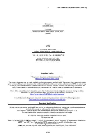 DECTTM, PLUGTESTSTM, UMTSTM and the ETSI logo are Trade Marks of ETSI registered for the benefit of its Members. 3GPPTM and LTE™ are Trade Marks of ETSI registered for the benefit of its Members and of the 3GPP Organizational Partners. GSM® and the GSM logo are Trade Marks registered and owned by the GSM Association. SIST EN 301 473 V2.1.2:2017