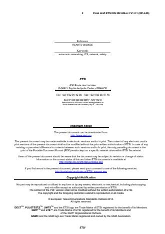 ETSI ETSI EN 302 636-4-1 V1.2.1 (2014-07)7 Intellectual Property Rights IPRs essential or potentially essential to the present document may have been declared to ETSI. The information pertaining to these essential IPRs, if any, is publicly available for ETSI members and non-members, and can be found in ETSI SR 000 314: "Intellectual Property Rights (IPRs); Essential, or potentially Essential, IPRs notified to ETSI in respect of ETSI standards", which is available from the ETSI Secretariat. Latest updates are available on the ETSI Web server (http://ipr.etsi.org). Pursuant to the ETSI IPR Policy, no investigation, including IPR searches, has been carried out by ETSI. No guarantee can be given as to the existence of other IPRs not referenced in ETSI SR 000 314 (or the updates on the ETSI Web server) which are, or may be, or may become, essential to the present document. Foreword This European Standard (EN) has been produced by ETSI Technical Committee Intelligent Transport Systems (ITS). The present document is part 4, sub-part 1 of a multi-part deliverable. Full details of the entire series can be found in part 1 [2].