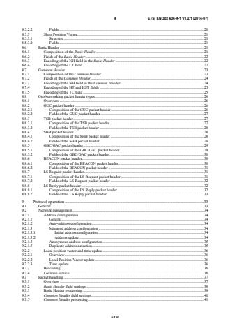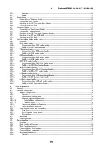 ETSI ETSI EN 302 636-4-1 V1.2.1 (2014-07)4 8.5.2.2 Fields . 20 8.5.3 Short Position Vector . 21 8.5.3.1 Structure . 21 8.5.3.2 Fields . 21 8.6 Basic Header . 21 8.6.1 Composition of the Basic Header . 21 8.6.2 Fields of the Basic Header . 22 8.6.3 Encoding of the NH field in the Basic Header . 22 8.6.4 Encoding of the LT field . 22 8.7 Common Header . 23 8.7.1 Composition of the Common Header . 23 8.7.2 Fields of the Common Header . 24 8.7.3 Encoding of the NH field in the Common Header . 24 8.7.4 Encoding of the HT and HST fields . 25 8.7.5 Encoding of the TC field . 25 8.8 GeoNetworking packet header types . 26 8.8.1 Overview . 26 8.8.2 GUC packet header . 26 8.8.2.1 Composition of the GUC packet header. 26 8.8.2.2 Fields of the GUC packet header . 27 8.8.3 TSB packet header . 27 8.8.3.1 Composition of the TSB packet header . 27 8.8.3.2 Fields of the TSB packet header . 28 8.8.4 SHB packet header. 28 8.8.4.1 Composition of the SHB packet header . 28 8.8.4.2 Fields of the SHB packet header . 29 8.8.5 GBC/GAC packet header . 29 8.8.5.1 Composition of the GBC/GAC packet header . 29 8.8.5.2 Fields of the GBC/GAC packet header . 30 8.8.6 BEACON packet header . 30 8.8.6.1 Composition of the BEACON packet header . 30 8.8.6.2 Fields of the BEACON packet header . 31 8.8.7 LS Request packet header . 31 8.8.7.1 Composition of the LS Request packet header. 31 8.8.7.2 Fields of the LS Request packet header . 32 8.8.8 LS Reply packet header . 32 8.8.8.1 Composition of the LS Reply packet header . 32 8.8.8.2 Fields of the LS Reply packet header . 33 9 Protocol operation . 33 9.1 General . 33 9.2 Network management . 34 9.2.1 Address configuration . 34 9.2.1.1 General . 34 9.2.1.2 Auto-address configuration . 34 9.2.1.3 Managed address configuration . 34 9.2.1.3.1 Initial address configuration . 34 9.2.1.3.2 Address update . 34 9.2.1.4 Anonymous address configuration . 35 9.2.1.5 Duplicate address detection . 35 9.2.2 Local position vector and time update . 36 9.2.2.1 Overview . 36 9.2.2.2 Local Position Vector update . 36 9.2.2.3 Time update. 36 9.2.3 Beaconing . 36 9.2.4 Location service . 36 9.3 Packet handling . 37 9.3.1 Overview . 37 9.3.2 Basic Header field settings . 38 9.3.3 Basic Header processing . 38 9.3.4 Common Header field settings. 40 9.3.5 Common Header processing . 41 SIST EN 302 636-4-1 V1.2.1:2014