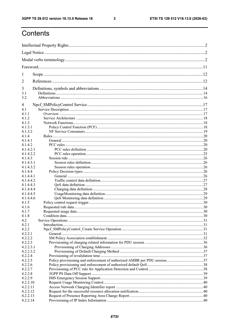 ETSI TS 129 512 V18.13.0 (2026-03) is a standard published by the European Telecommunications Standards Institute (ETSI). Its full title is "5G; 5G System; Session Management Policy Control Service; Stage 3 (3GPP TS 29.512 version 18.13.0 Release 18)". This standard covers: RTS/TSGC-0329512vid0