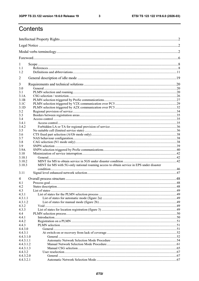 ETSI TS 123 122 V19.6.0 (2026-03) - Digital cellular telecommunications system (Phase 2+) (GSM); Universal Mobile Telecommunications System (UMTS); LTE; 5G; Non-Access-Stratum (NAS) functions related to Mobile Station (MS) in idle mode (3GPP TS 23.122 version 19.6.0 Release 19)