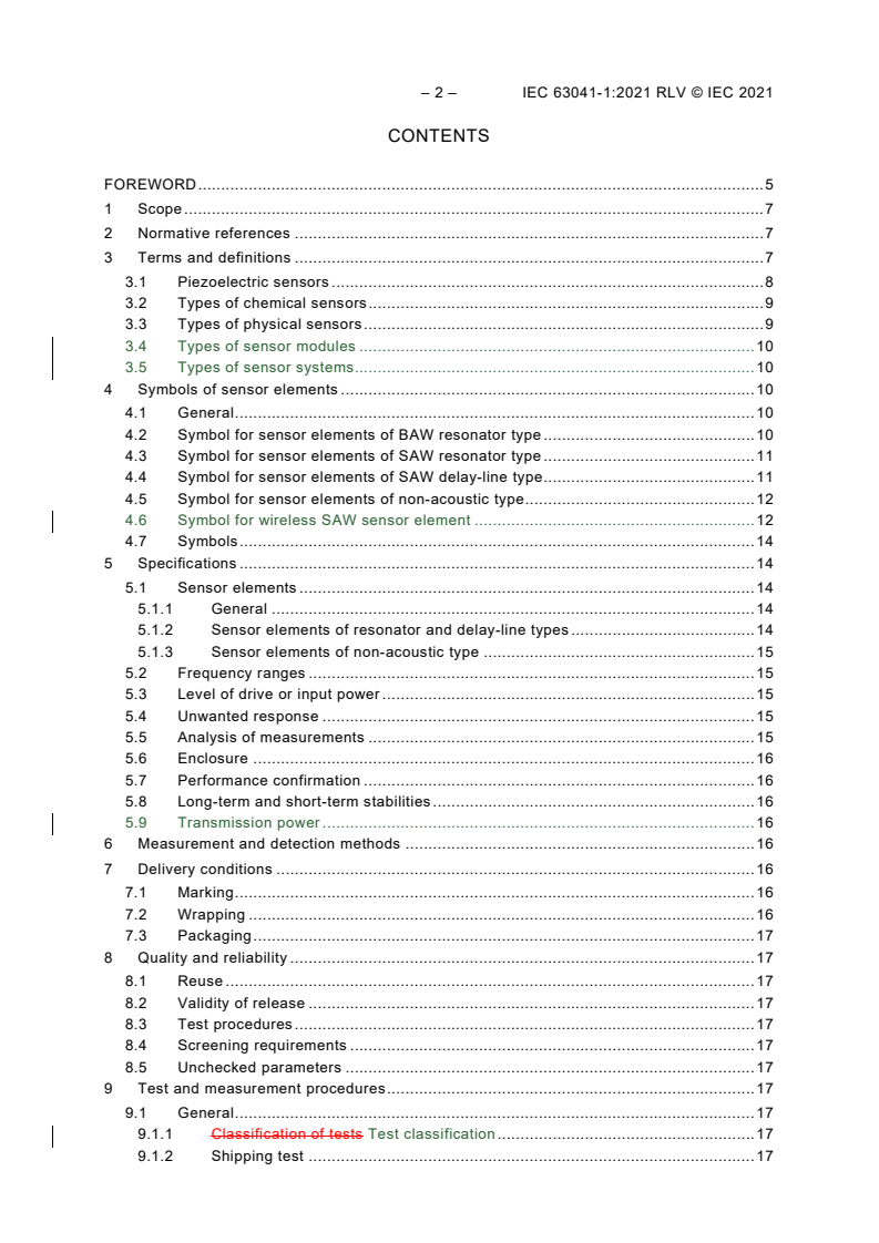 제목: IEC 63041-1:2021 - 피에조전식 센서 - 제 1 부 : 일반 사양 내용: IEC 63041-1:2021은 이전 판과의 기술 내용 변경점을 모두 보여주는 국제 표준과 그 리드라인 버전인 IEC 63041-1:2021 RLV로 이용 가능하다. IEC 63041-1:2021은 물리학, 공학, 화학, 생화학, 의학, 환경과학 등 다양한 분야에서 사용하는 공진체, 지연선 및 비음각형의 피에조전식 센서에 적용된다. 이 문서의 목적은 피에조전식 센서에 대한 용어와 정의를 명시하고, 기술적인 관점에서 사용자들이 최신 피에조전식 센서의 상태와 올바르게 사용하는 방법을 이해할 수 있도록 하는 것이다. 이번 판에는 다음과 같은 주요 기술적인 변경점들이 포함되어 있다: - "피에조전식 센서 시스템"과 "무선 SAW 센서 시스템"이라는 새로운 용어와 그 정의가 추가되었다. - 새로운 유형의 센서 모듈과 센서 시스템이 추가되었다. - 제 4 절에 센서 요소들의 심볼이 추가되었다. - 부록 B에 새로운 B.3 도표가 추가되었다. - 부록 C가 추가되었다.