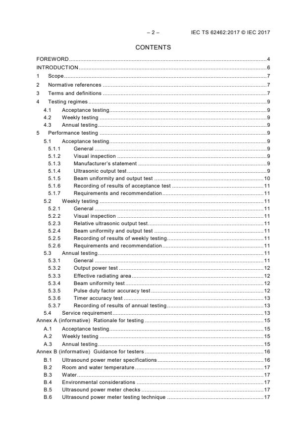 IEC TS 62462:2017 is a technical specification published by the International Electrotechnical Commission (IEC). Its full title is "Ultrasonics - Output test - Guidance for the maintenance of ultrasound physiotherapy systems". This standard covers: IEC TS 62462:2017(E) describes methods meant to assist users of ultrasound physiotherapy systems in checking the performance of such systems. It is applicable primarily to physiotherapists, general medical practitioners, chiropractors, osteopaths, beauty therapists, sports professionals, biomedical engineers, medical physicists, medical device service agents, commercial testers, test houses or manufacturers. This new edition includes the following significant technical change with respect to the previous edition: it includes a novel method for periodic testing regarding possible changes of the effective radiating area using thermochromic absorbers in a new Annex E.