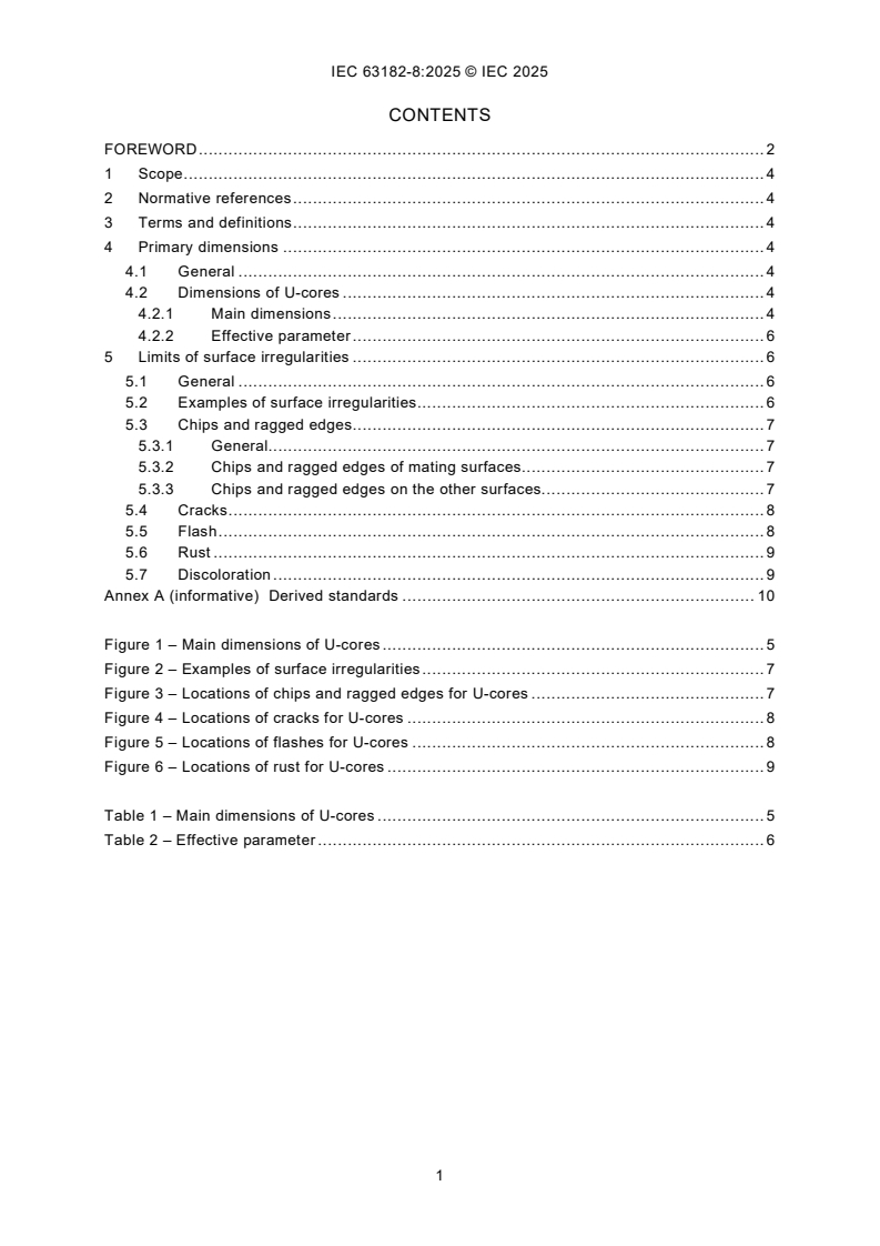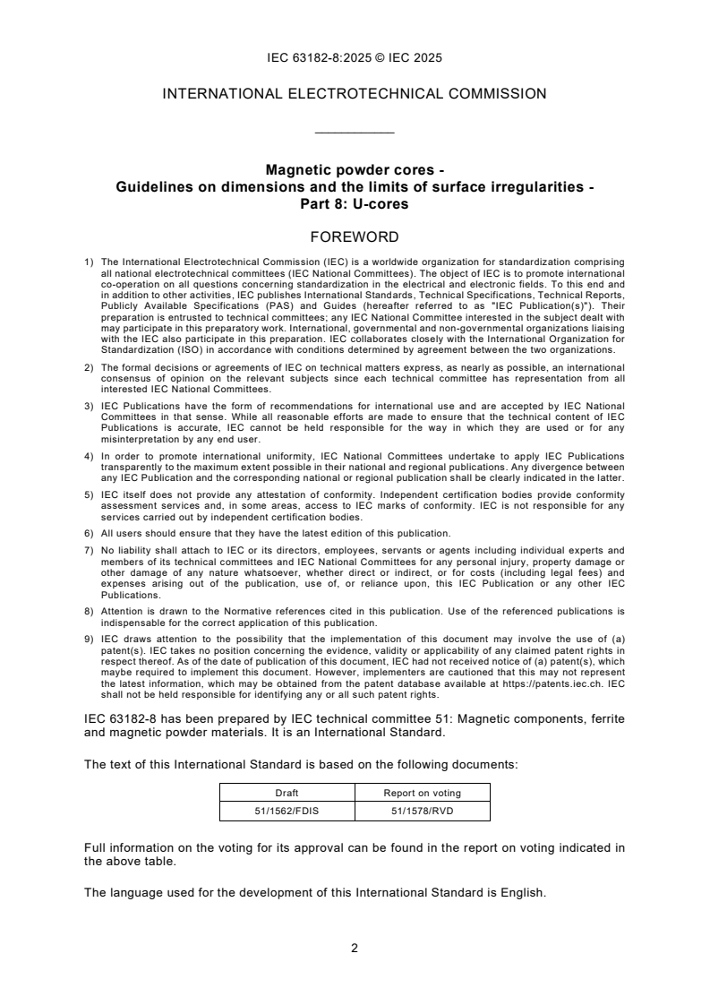 IEC 63182-8:2025 is a standard published by the International Electrotechnical Commission (IEC). Its full title is "Magnetic powder cores - Guidelines on dimensions and the limits of surface irregularities - Part 8: U-cores". This standard covers: IEC 63182-8:2025 specifies the dimensions that are of importance for mechanical interchangeability for a preferred range of U-cores made of metallic magnetic powder and gives guidelines on allowable limits of surface irregularities applicable to U-cores. This document is a specification that is useful in the negotiations between magnetic powder core manufacturers and customers about surface irregularities. The use of "derived" standards which give more detailed specifications of component parts while still permitting conformance with this document is discussed in Annex A.