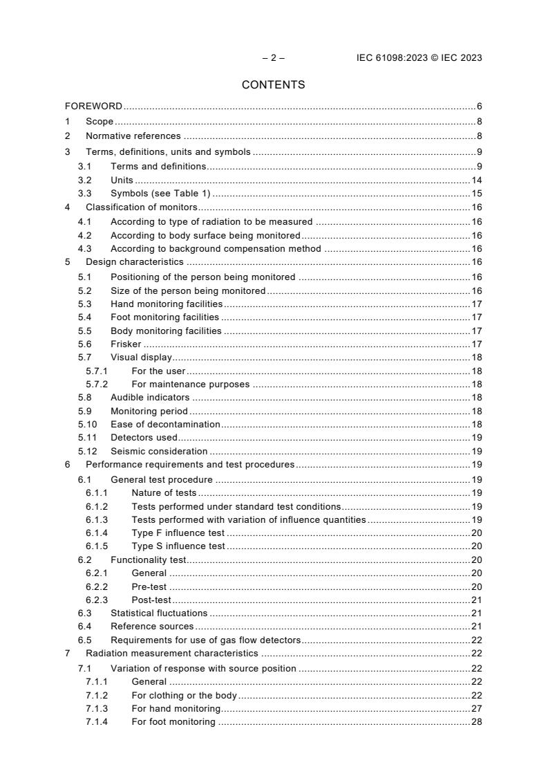 IEC 61098:2023 applies to contamination monitors that include warning assembles and meters used for the monitoring of radioactive contamination on the surface of personnel whether they be clothed or not. The document is applicable only to that type of equipment where the user stays at the monitor. This document is applicable to the monitoring of the whole body (including the head), hands and feet, but parts of this document can be used for monitors designed for the monitoring of radioactive contamination on the hands and/or feet only. This document does not include tritium measurement. This third edition cancels and replaces the second edition published in 2003. This edition includes the following significant technical changes with respect to the previous edition: a. Title is modified. b. As an alternative of small area sources, area sources are added to be used for methods of test with respect to the variation of response with source position, effective instrument efficiency, detection limit (DL), and variation of response with energy. c. Detection limit (DL) complies with the ISO 11929 series. d. Descriptions of influence quantities of type F and type S are added. e. Consistency with IEC 62706 is promoted for environmental requirements, mechanical requirements, electromagnetic compatibility and methods of test. f. Descriptions of overhead detectors are added. g. Descriptions of friskers are added with respect to the hand and foot monitoring. h. Figures are made easier to understand the relation between the detector position and the response, and the positional relation between the detector surface and the source.