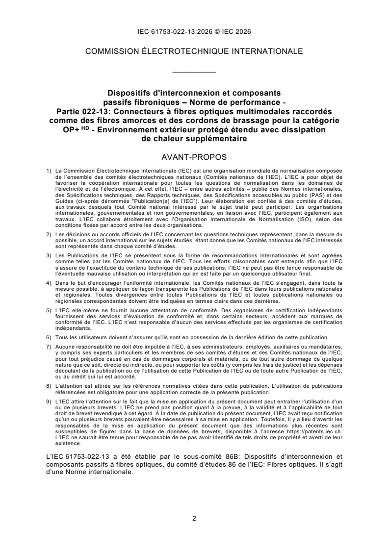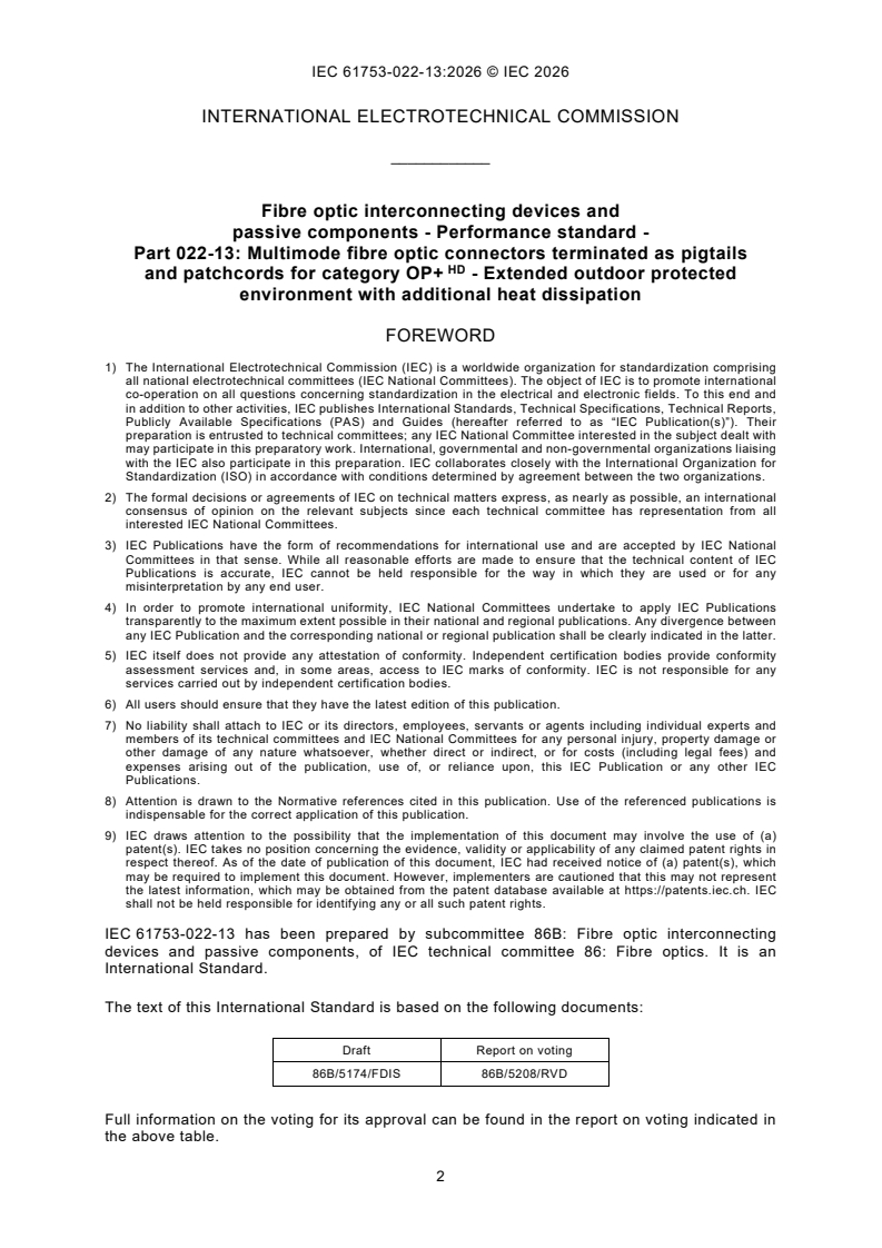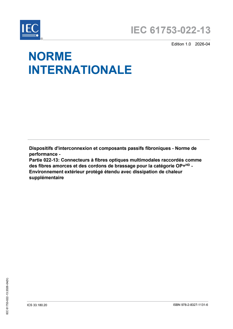 IEC 61753-022-13:2026 defines the minimum initial test and measurement requirements, and severities which multimode fibre optic connectors terminated as a pigtail or a patchcord satisfy in order to be categorized as meeting the IEC standard category OP+HP (Extended outdoor protected environment with additional heat dissipation), as defined in IEC 61753-1.