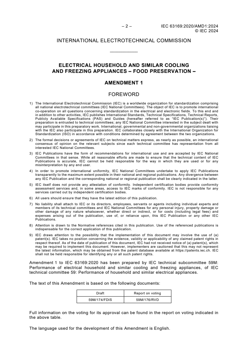 IEC 63169:2020/AMD1:2024 is a standard published by the International Electrotechnical Commission (IEC). Its full title is "Amendment 1 - Electrical household and similar cooling and freezing appliances - Food preservation". This standard covers: Amendment 1 - Electrical household and similar cooling and freezing appliances - Food preservation
