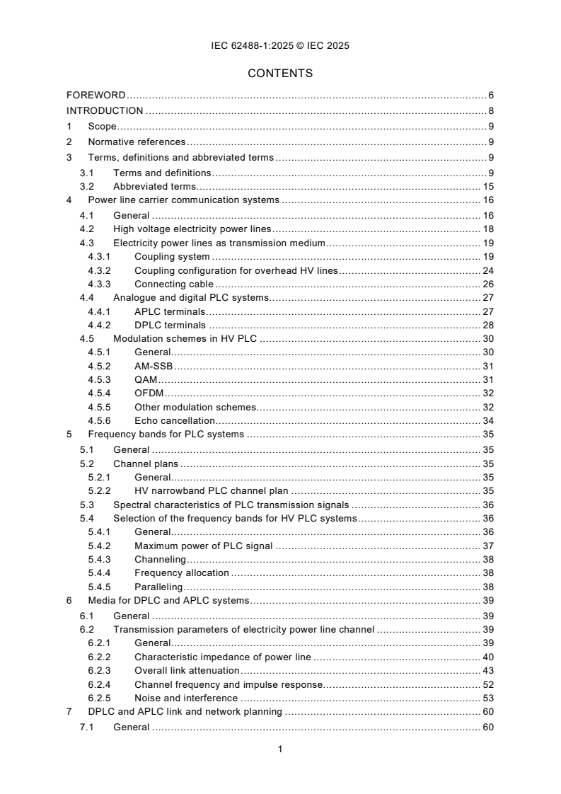 IEC 62488-1:2025 applies to the planning of analogue (APLC), digital (DPLC) and hybrid analogue-digital (ADPLC) power line carrier communication systems operating over HV electric power networks. The object of this document is to establish the planning of the services and performance parameters for the operational requirements to transmit and receive data efficiently and reliably. Such analogue and digital power line carrier systems are used by the different electricity supply industries and integrated into their communication infrastructure using common communication technologies such as radio links, fibre optic and satellite networks This second edition cancels and replaces the first edition published in 2012. This edition constitutes a technical revision. This edition includes the following significant technical changes with respect to the previous edition: a) Complete revision of this edition with respect to the previous edition with the main focus on planning of analogue and digital power line carrier systems operating over HV power networks; b) A general structure of a bidirectional point-to-multipoint APLC, DPLC or ADPLC link has been introduced; c) Introduction of a new approach for global frequency planning.
