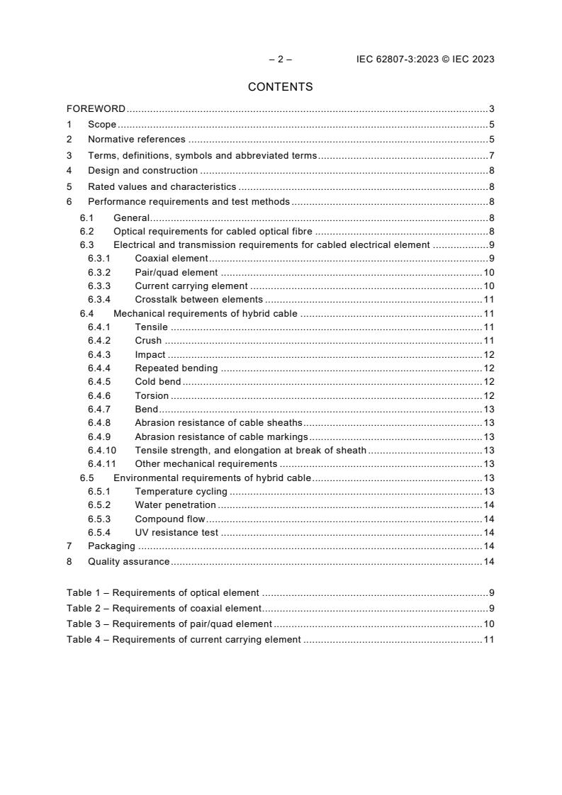 Keywords: IEC 62807-3:2023, hybrid telecommunication cables, outdoor hybrid cables, optical fibre, coaxial, pair/quad, current-carrying element, MICE, ISO/IEC 11801-1.