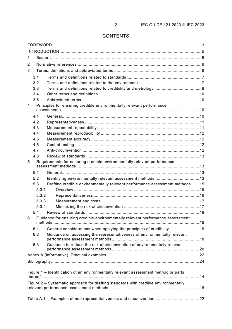 IEC GUIDE 121:2023 specifies principles, requirements, and guidance for standard writers to identify whether an assessment method in their standard can be used to obtain an indication of the environmental performance of a product and to ensure that such assessment is credible. This Guide applies to standards covering environmental performance of new products and as appropriate to standards covering environmental performance of second life products (e.g., refurbished or remanufactured). This Guide is therefore intended to ensure that assessment methods developed by standard writers are credible. The credibility of an environmentally relevant performance assessment method is determined by taking into account all the related principles, namely representativeness, measurement repeatability, measurement reproducibility, measurement accuracy, cost of testing, as well as circumvention. Environmentally relevant performance assessment methods can be present in many IEC standards (e.g., standards covering performance aspects of products), and not only those focused on the environment. This Guide will be applicable to those as well. This Guide is not applicable to standards containing environmentally relevant performance assessment methods that are not assessed by test (e.g., assessment by inspection or simulation). Nor is it applicable to other aspects not linked to environment, such as EMC and EMF.