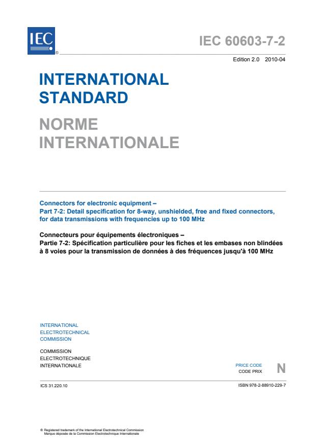 La CEI 60603-7-2:2010 couvre les fiches et les embases non blindées à 8 voies et renvoie à la CEI 60603-7 pour les caractéristiques et les essais dimensionnels, mécaniques, électriques et d'environnement et elle spécifie les exigences de transmission électrique pour des fréquences jusqu'à 100 MHz. Ces connecteurs sont normalement utilisés comme connecteurs de catégorie 5 dans les systèmes de câblage de classe D spécifiés dans l'ISO/CEI 11801. Ces connecteurs sont accouplables et interopérables avec les autres connecteurs de la série CEI 60603-7 comme cela est défini à l'article 2 de la CEI 60603-7. Ces connecteurs offrent une compatibilité amont avec les autres connecteurs de la série CEI 60603-7.