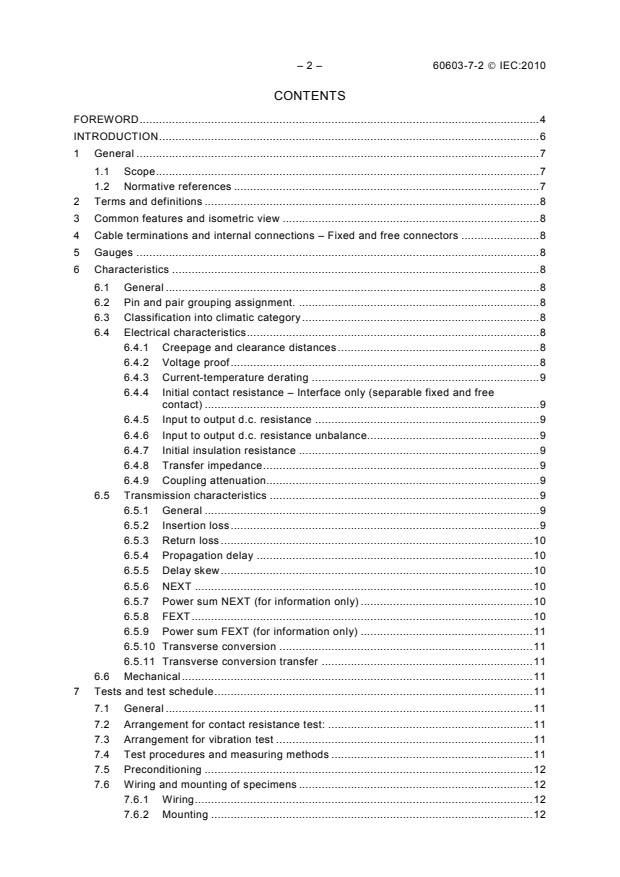IEC 60603-7-2:2010 covers 8-way, unshielded, free and fixed connectors, references dimensional, mechanical, electrical and environmental characteristics and tests in IEC 60603-7, and specifies electrical transmission requirements for frequencies up to 100 MHz. These connectors are typically used as category 5 connectors in class D cabling systems specified in ISO/IEC IS 11801. These connectors are intermateable and interoperable with other IEC 60603-7 series connectors as defined in Clause 2 of IEC 60603-7. These connectors are backward compatible with other IEC 60603-7 series connectors.