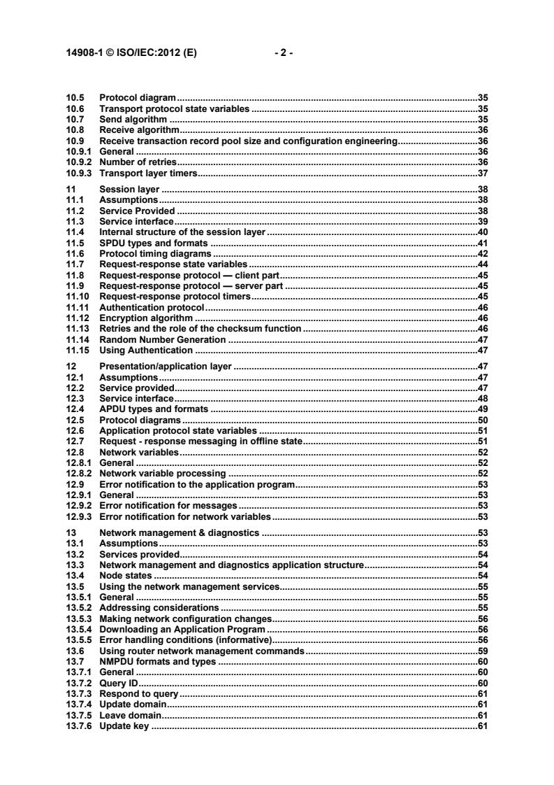 ISO/IEC 14908-1:2012 specifies a communication protocol for local area control networks. The protocol provides peer-to-peer communication for networked control and is suitable for implementing both peer-to-peer and master-slave control strategies. ISO/IEC 14908-1:2012 describes services in layers 2 to 7. In the layer 2 (data link layer) specification, it also describes the Medium Access Control (MAC) sublayer interface to the physical layer. The physical layer provides a choice of transmission media. The interface described in ISO/IEC 14908-1:2012 supports multiple transmission media at the physical layer. In the layer 7 specification, it includes a description of the types of messages used by applications to exchange application and network management data.